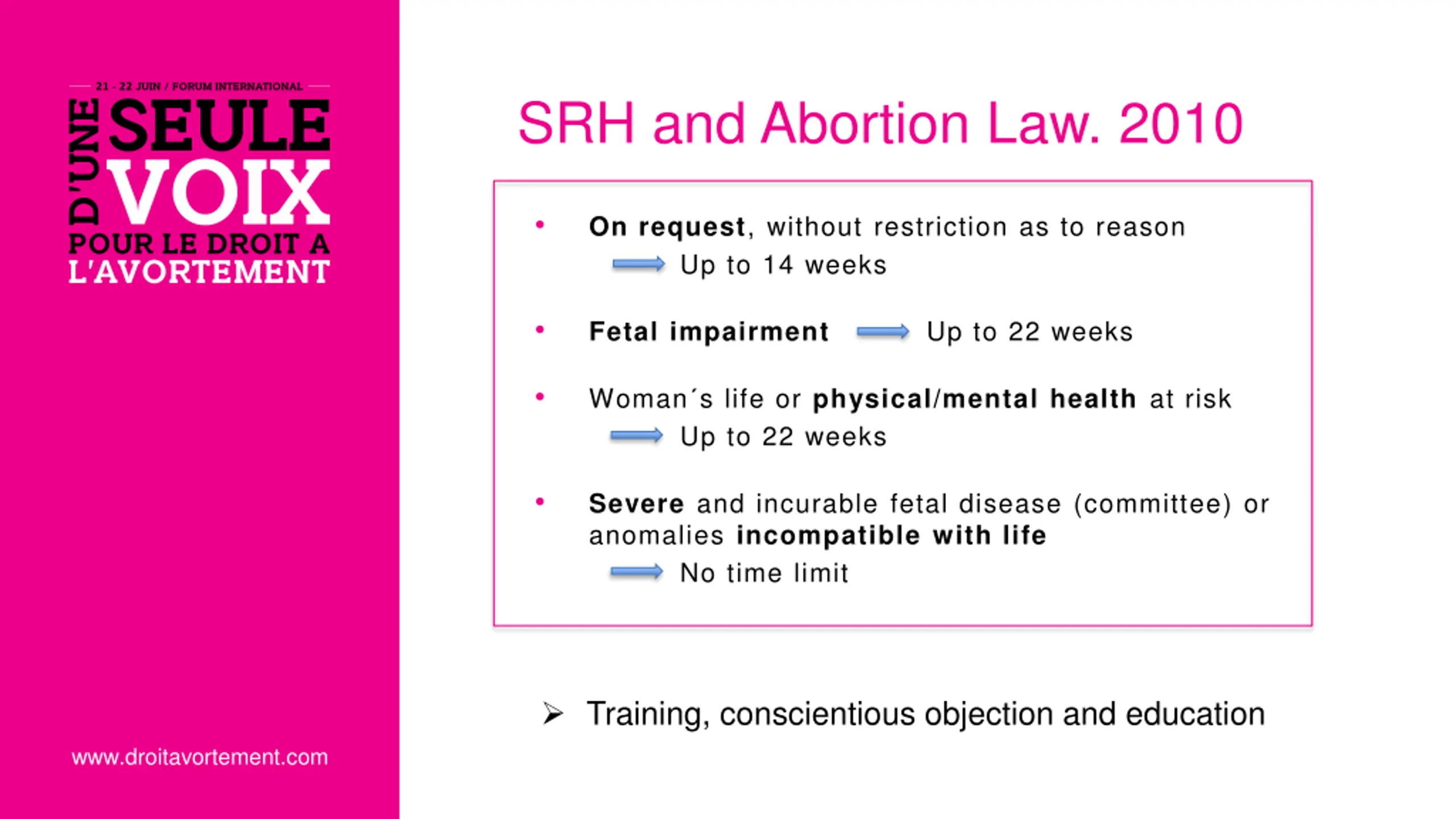 SRH and Abortion Law. 2010 On request, without restriction as to reason Up to 14 weeks Up to 22 weeks Fetal impairment Woman s life or physical/mental health at risk Up to 22 weeks Severe and incurable fetal disease (committee) or anomalies incompatible with life No time limit Training, conscientious objection and education www.droitavortement.com