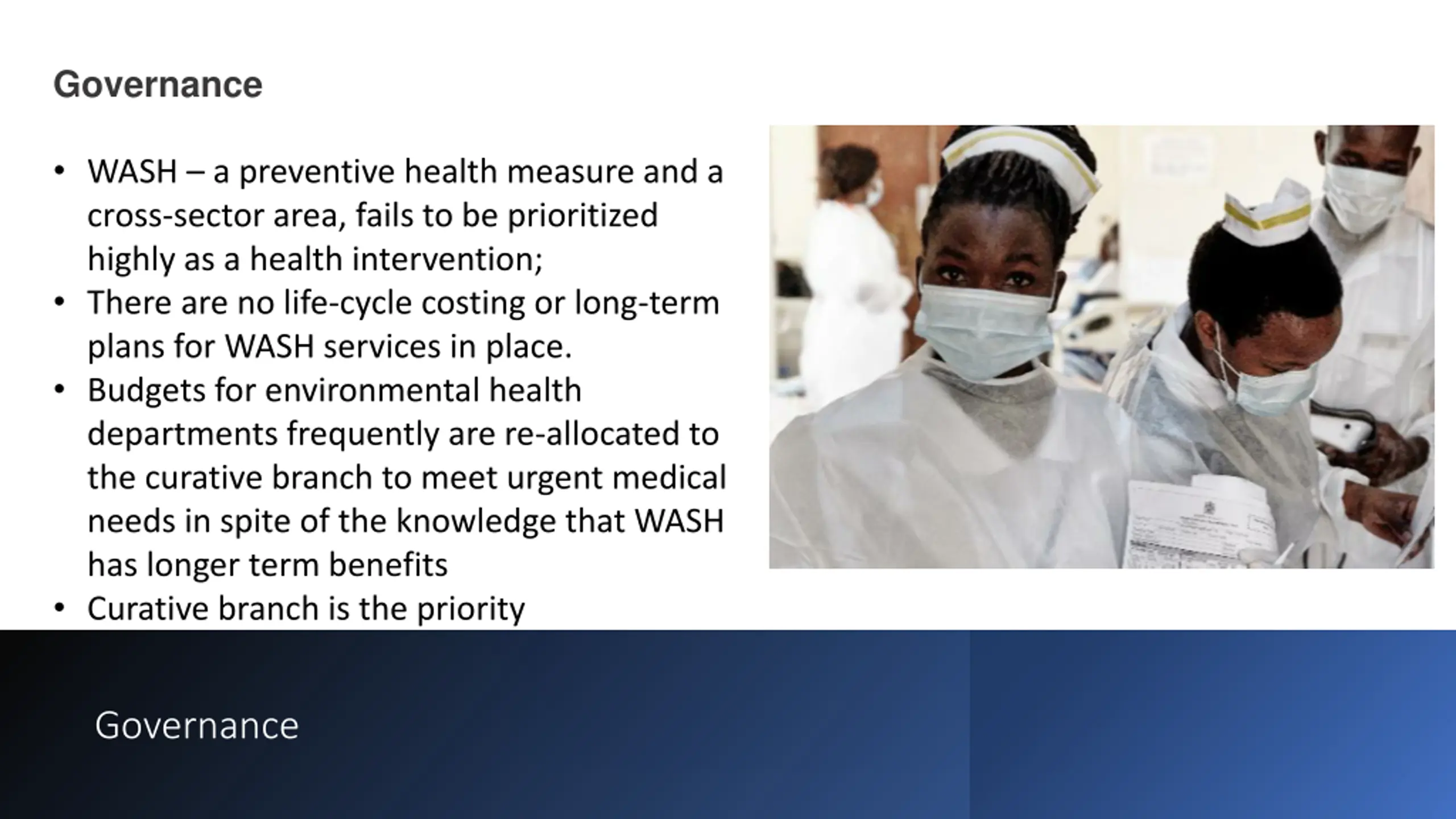Governance WASH a preventive health measure and a cross-sector area, fails to be prioritized highly as a health intervention; There are no life-cycle costing or long-term plans for WASH services in place. Budgets for environmental health departments frequently are re-allocated to the curative branch to meet urgent medical needs in spite of the knowledge that WASH has longer term benefits Curative branch is the priority Governance