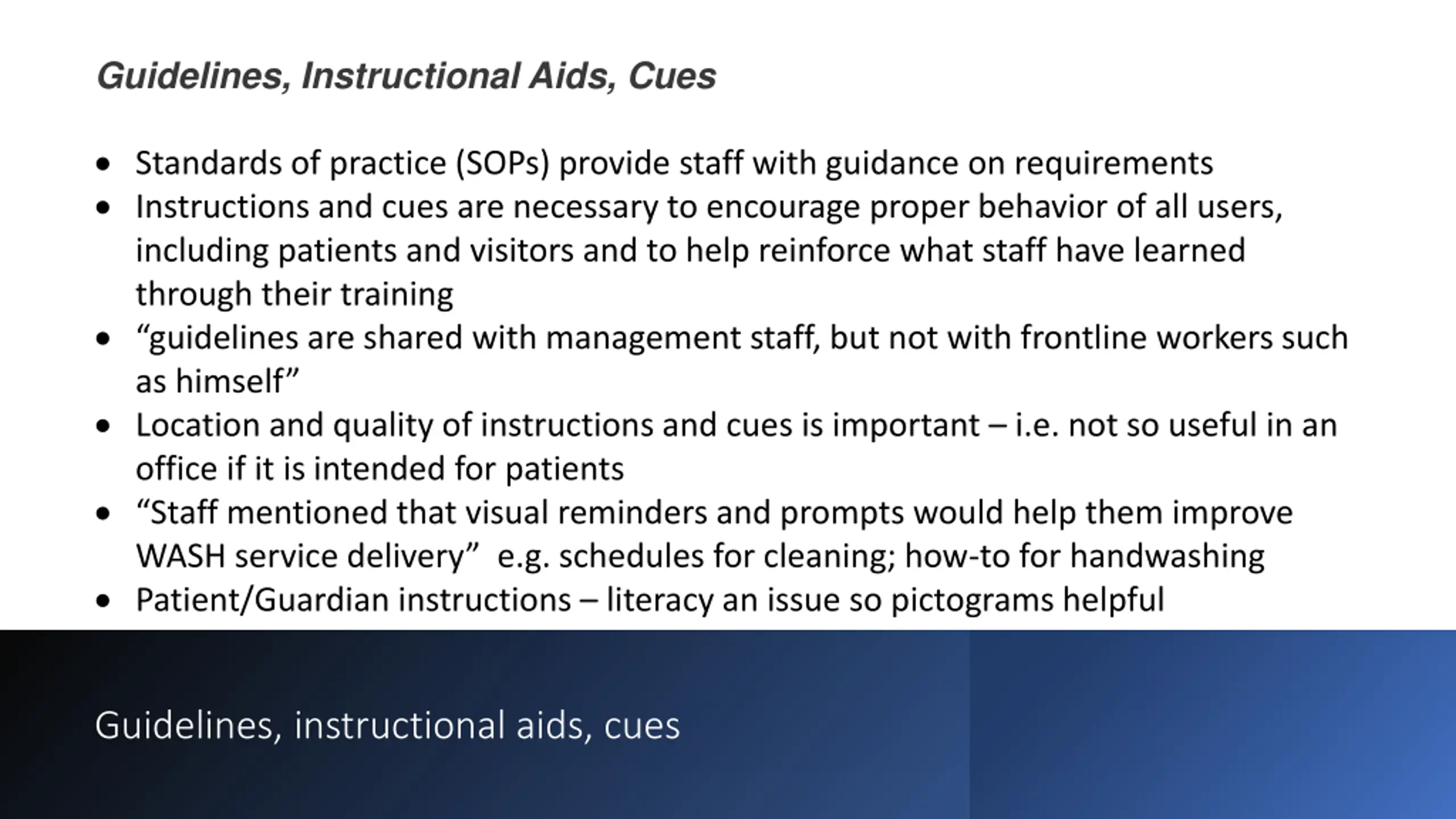 Guidelines, Instructional Aids, Cues Standards of practice (SOPs) provide staff with guidance on requirements Instructions and cues are necessary to encourage proper behavior of all users, including patients and visitors and to help reinforce what staff have learned through their training guidelines are shared with management staff, but not with frontline workers such as himself Location and quality of instructions and cues is important i.e. not so useful in an office if it is intended for patients Staff mentioned that visual reminders and prompts would help them improve WASH service delivery e.g. schedules for cleaning; how-to for handwashing Patient/Guardian instructions literacy an issue so pictograms helpful Guidelines, instructional aids, cues