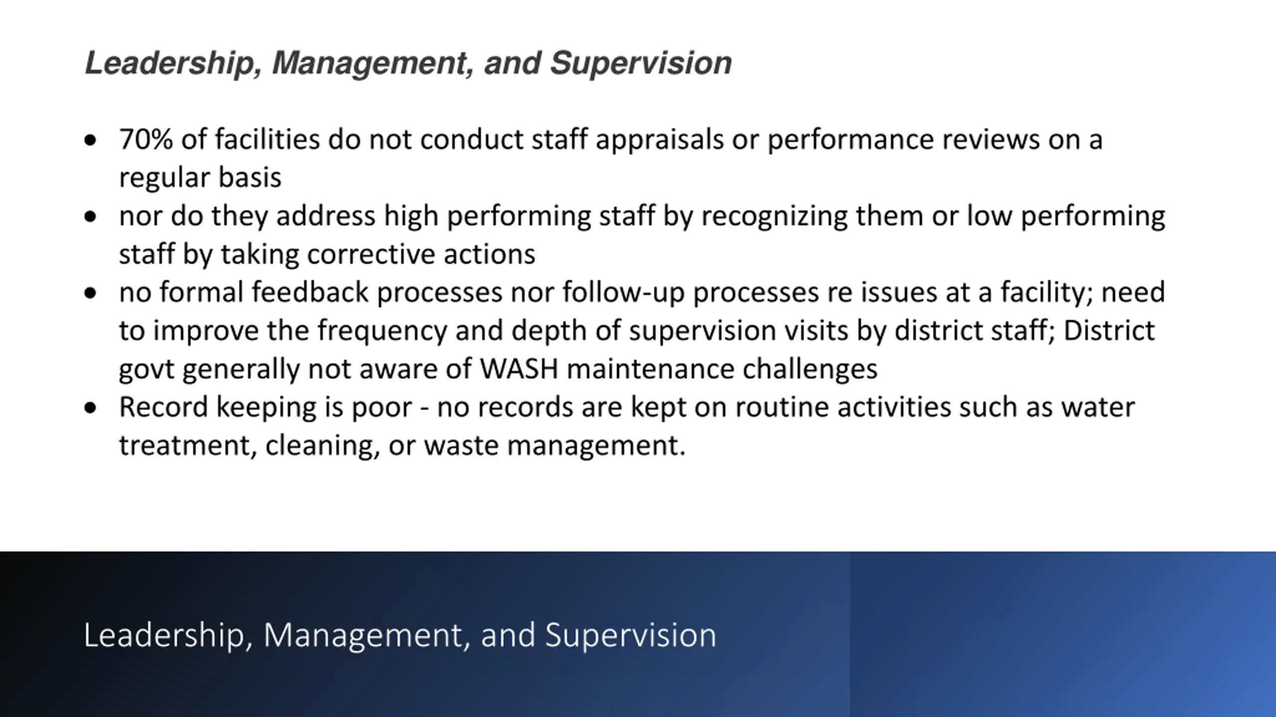 Leadership, Management, and Supervision 70% of facilities do not conduct staff appraisals or performance reviews on a regular basis nor do they address high performing staff by recognizing them or low performing staff by taking corrective actions no formal feedback processes nor follow-up processes re issues at a facility; need to improve the frequency and depth of supervision visits by district staff; District govt generally not aware of WASH maintenance challenges Record keeping is poor - no records are kept on routine activities such as water treatment, cleaning, or waste management. Leadership, Management, and Supervision