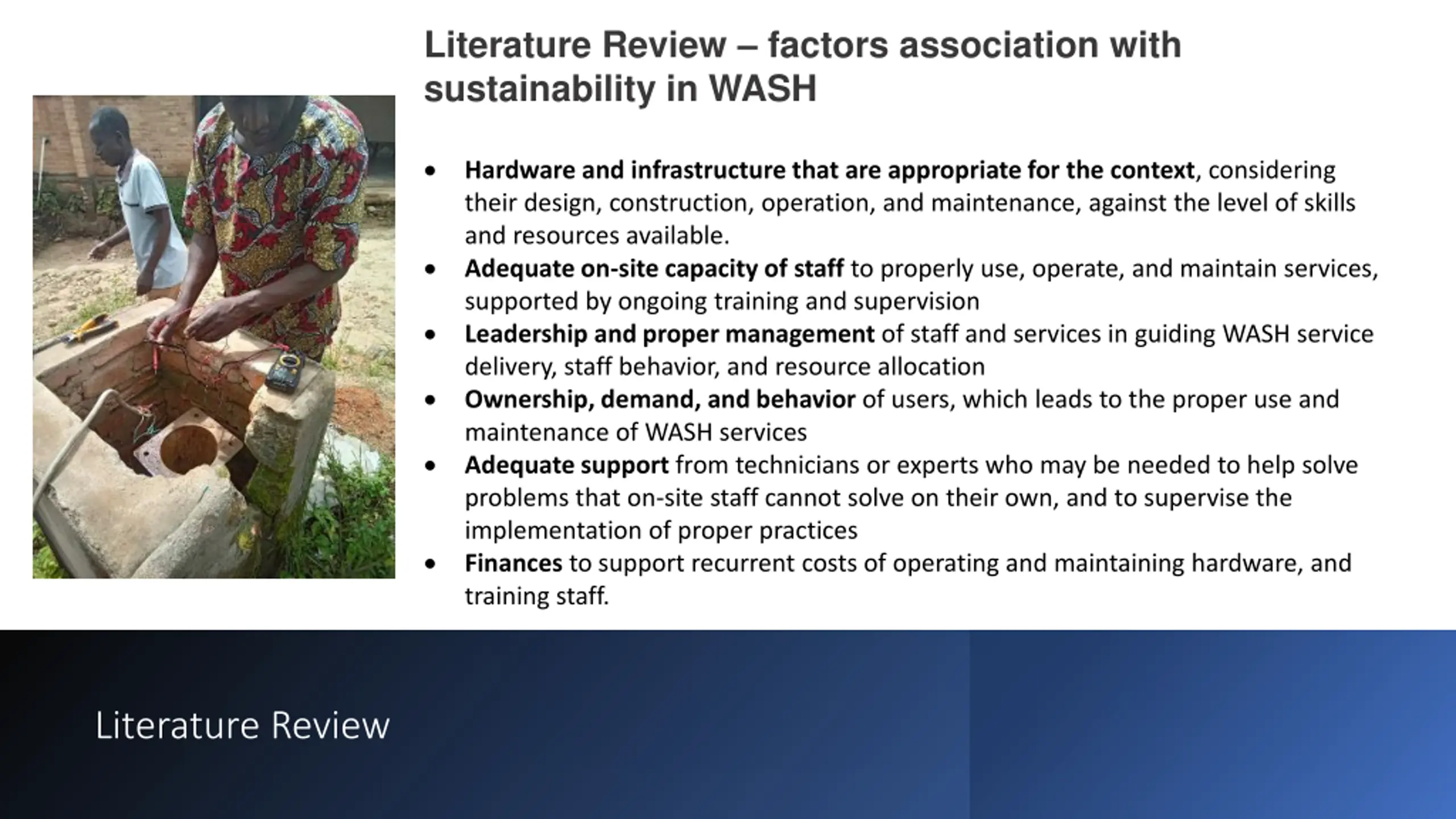 Literature Review factors association with sustainability in WASH Hardware and infrastructure that are appropriate for the context, considering their design, construction, operation, and maintenance, against the level of skills and resources available. Adequate on-site capacity of staff to properly use, operate, and maintain services, supported by ongoing training and supervision Leadership and proper management of staff and services in guiding WASH service delivery, staff behavior, and resource allocation Ownership, demand, and behavior of users, which leads to the proper use and maintenance of WASH services Adequate support from technicians or experts who may be needed to help solve problems that on-site staff cannot solve on their own, and to supervise the implementation of proper practices Finances to support recurrent costs of operating and maintaining hardware, and training staff. Literature Review