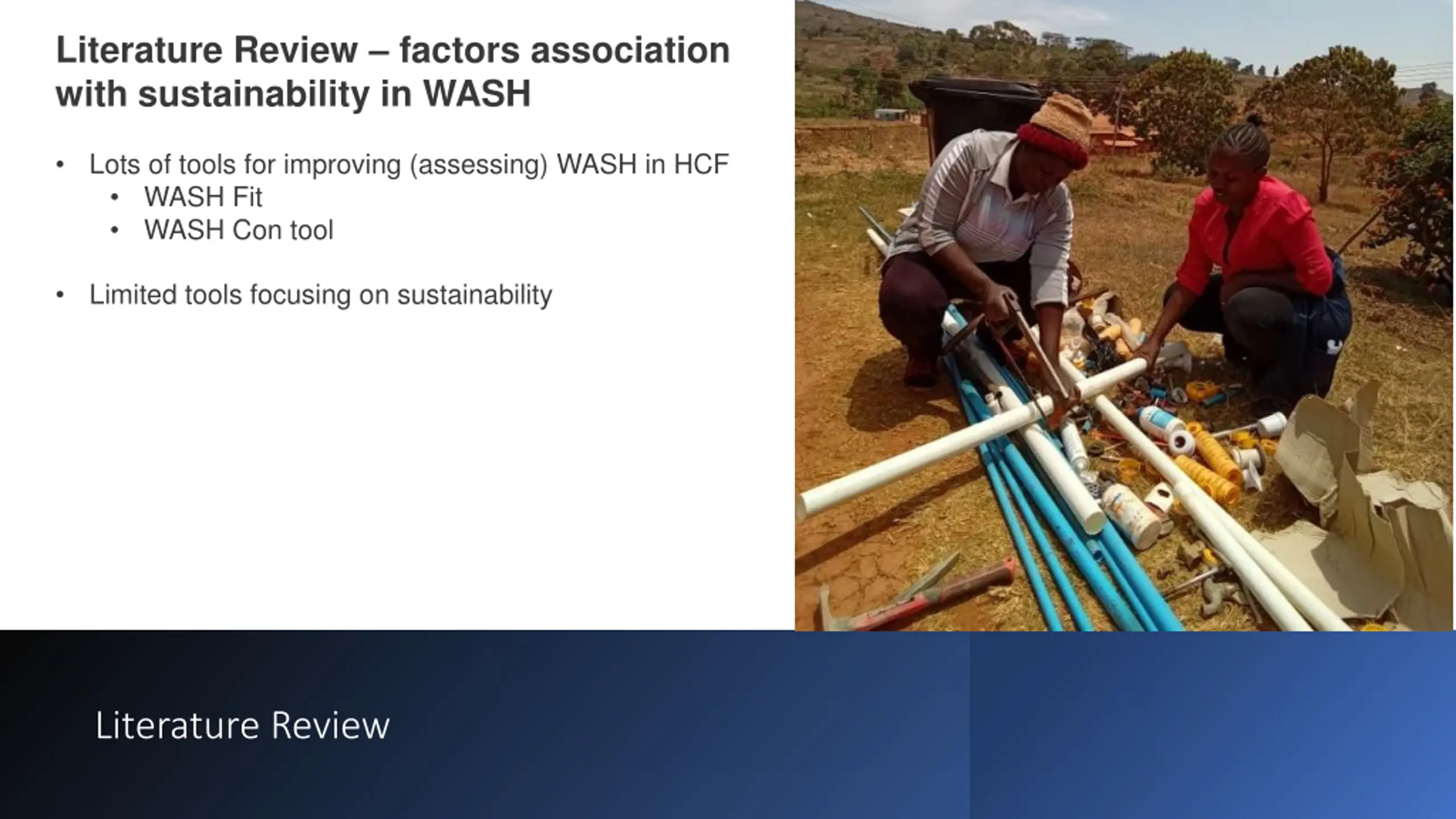 Literature Review factors association with sustainability in WASH Lots of tools for improving (assessing) WASH in HCF WASH Fit WASH Con tool Limited tools focusing on sustainability Literature Review