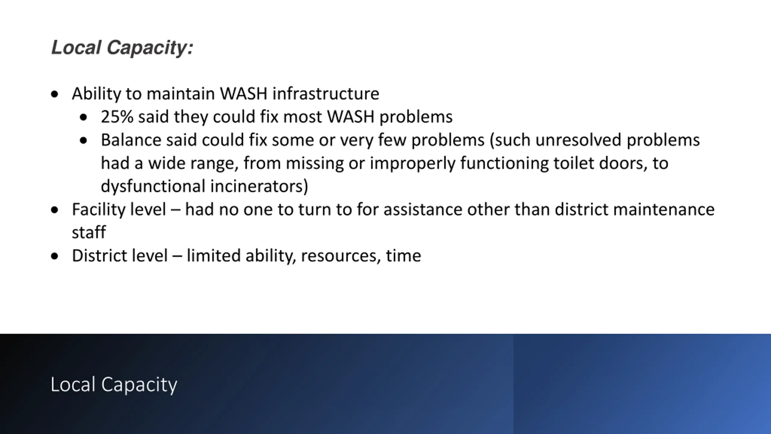 Local Capacity: Ability to maintain WASH infrastructure 25% said they could fix most WASH problems Balance said could fix some or very few problems (such unresolved problems had a wide range, from missing or improperly functioning toilet doors, to dysfunctional incinerators) Facility level had no one to turn to for assistance other than district maintenance staff District level limited ability, resources, time Local Capacity
