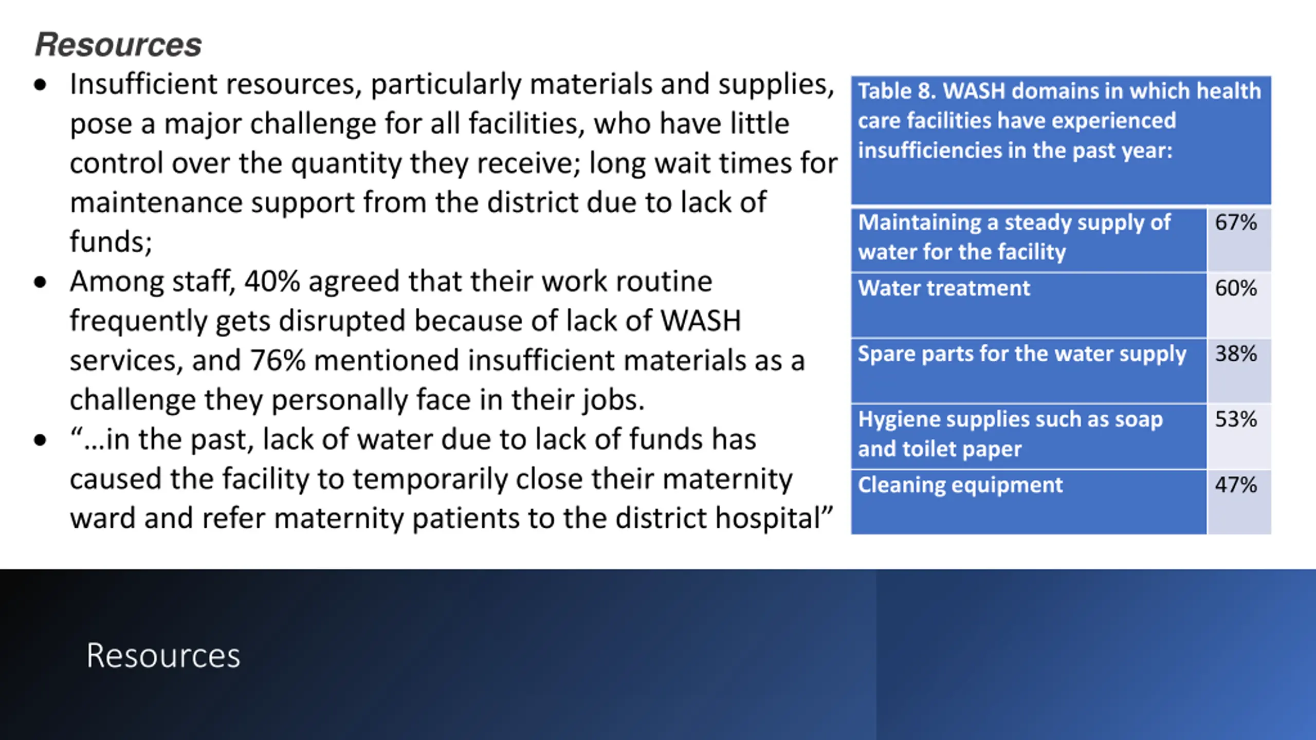 Resources Insufficient resources, particularly materials and supplies, pose a major challenge for all facilities, who have little control over the quantity they receive; long wait times for maintenance support from the district due to lack of funds; Among staff, 40% agreed that their work routine frequently gets disrupted because of lack of WASH services, and 76% mentioned insufficient materials as a challenge they personally face in their jobs. in the past, lack of water due to lack of funds has caused the facility to temporarily close their maternity ward and refer maternity patients to the district hospital Table 8. WASH domains in which health care facilities have experienced insufficiencies in the past year: Maintaining a steady supply of water for the facility Water treatment 67% 60% Spare parts for the water supply 38% Hygiene supplies such as soap and toilet paper Cleaning equipment 53% 47% Resources