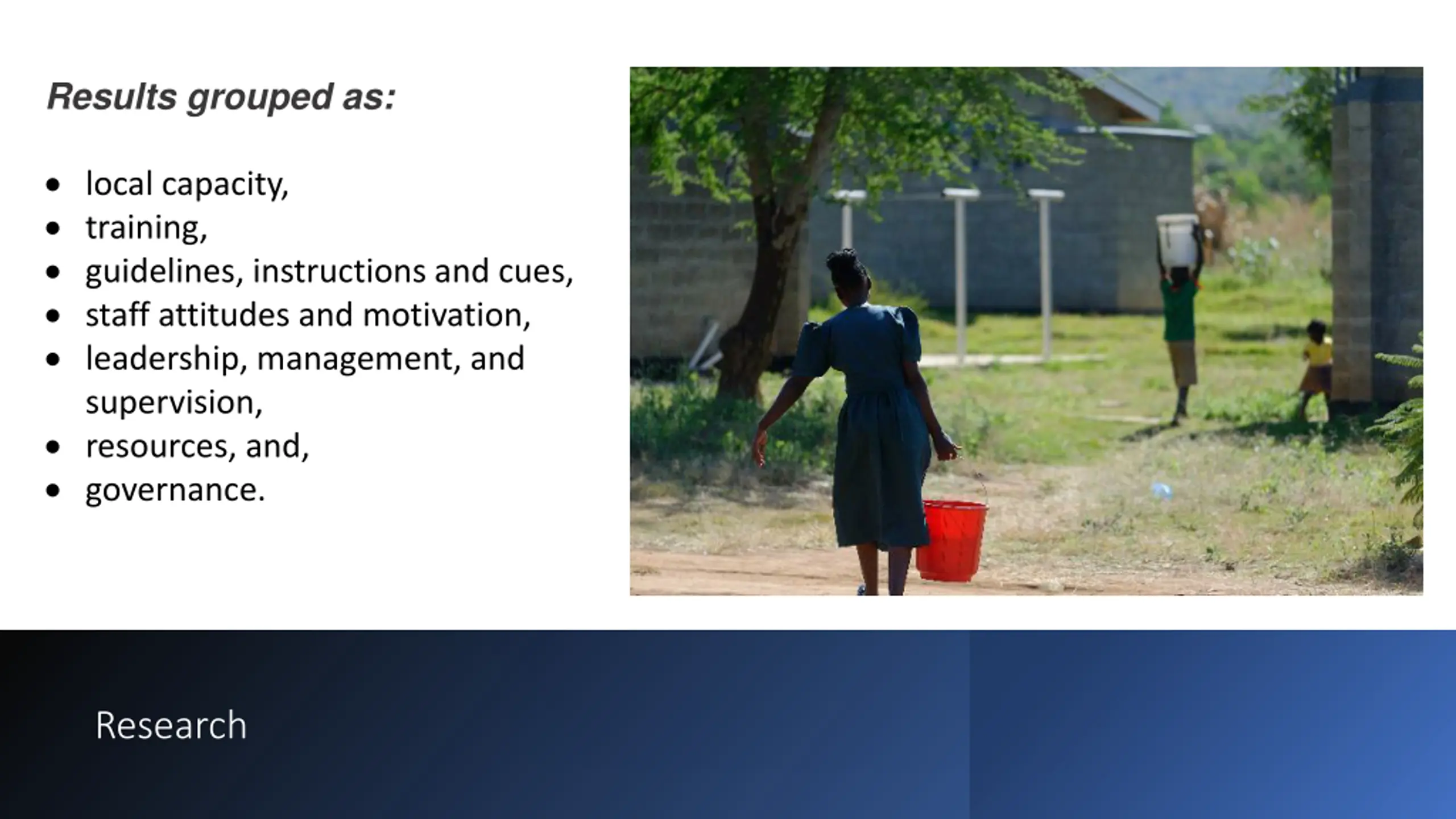 Results grouped as: local capacity, training, guidelines, instructions and cues, staff attitudes and motivation, leadership, management, and supervision, resources, and, governance. Research