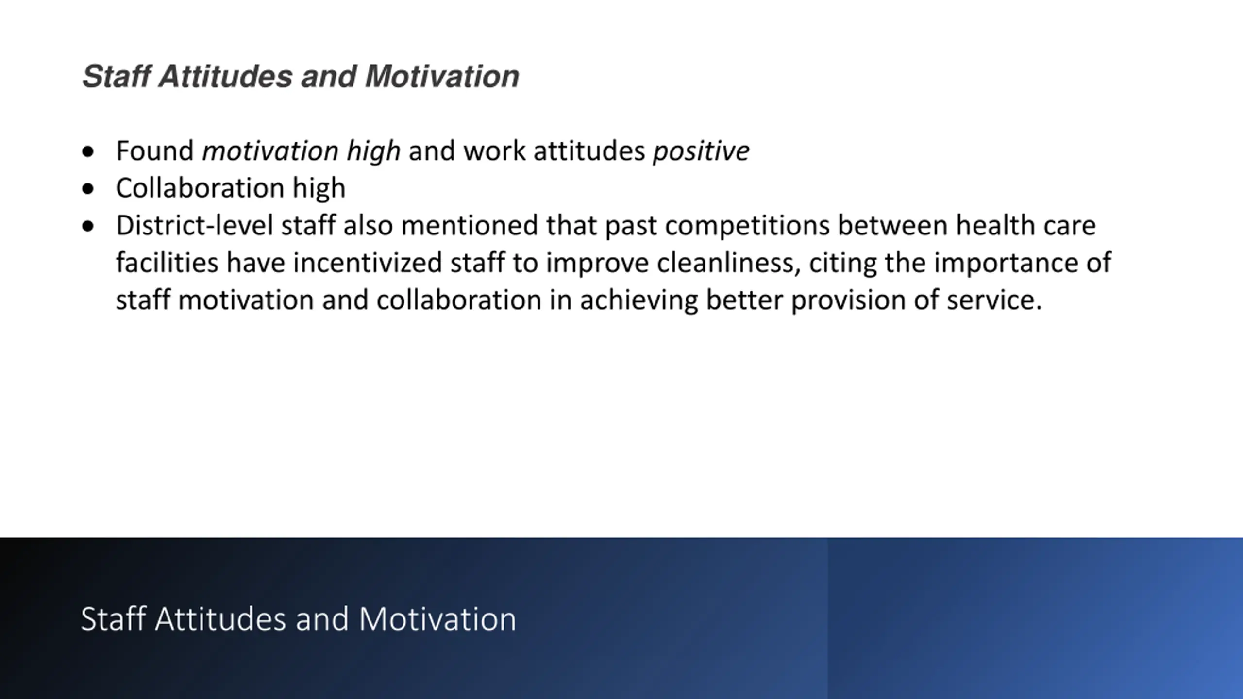 Staff Attitudes and Motivation Found motivation high and work attitudes positive Collaboration high District-level staff also mentioned that past competitions between health care facilities have incentivized staff to improve cleanliness, citing the importance of staff motivation and collaboration in achieving better provision of service. Staff Attitudes and Motivation