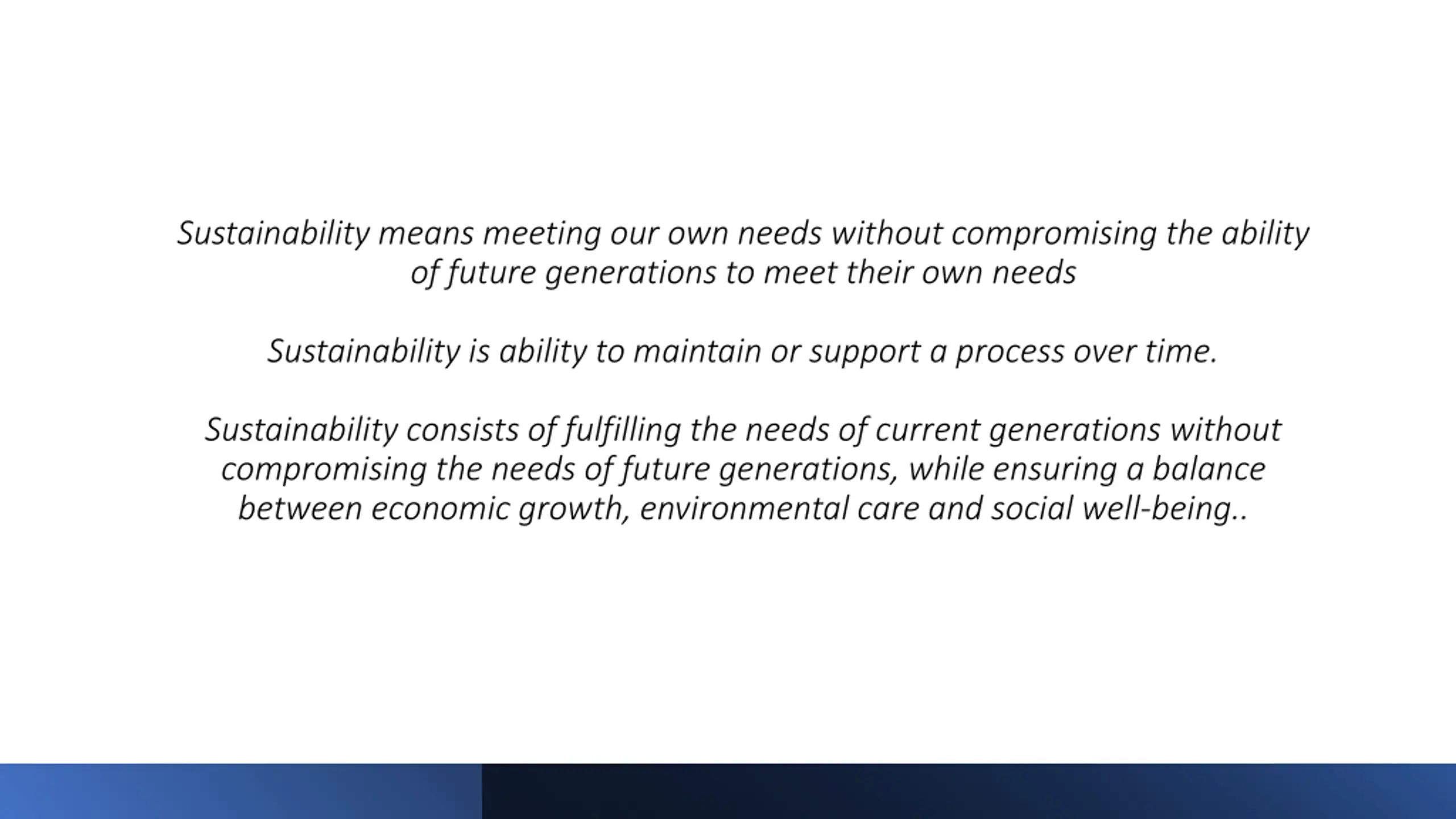 Sustainability means meeting our own needs without compromising the ability of future generations to meet their own needs Sustainability is ability to maintain or support a process over time. Sustainability consists of fulfilling the needs of current generations without compromising the needs of future generations, while ensuring a balance between economic growth, environmental care and social well-being..
