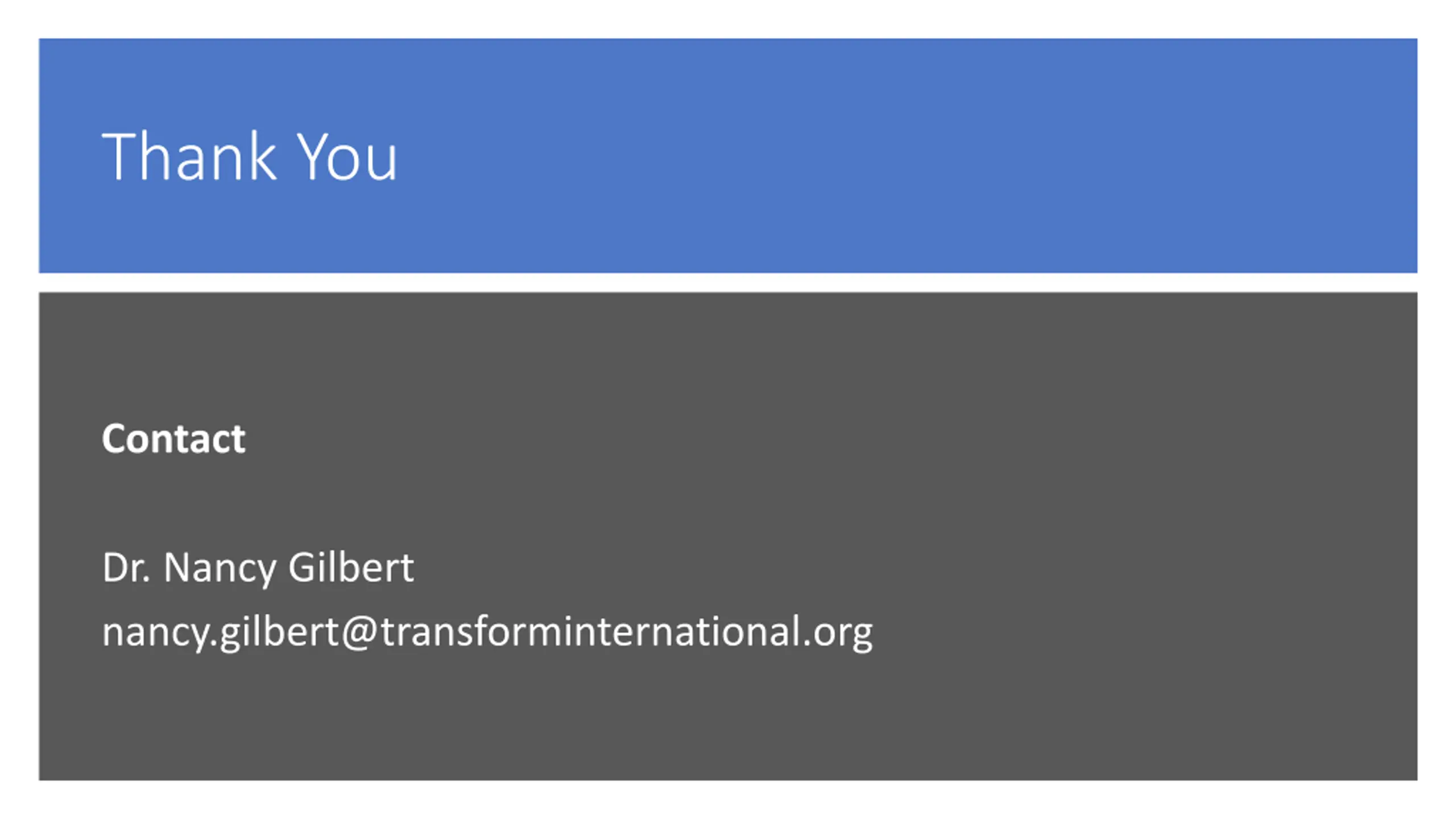 Thank You Contact Dr. Nancy Gilbert nancy.gilbert@transforminternational.org