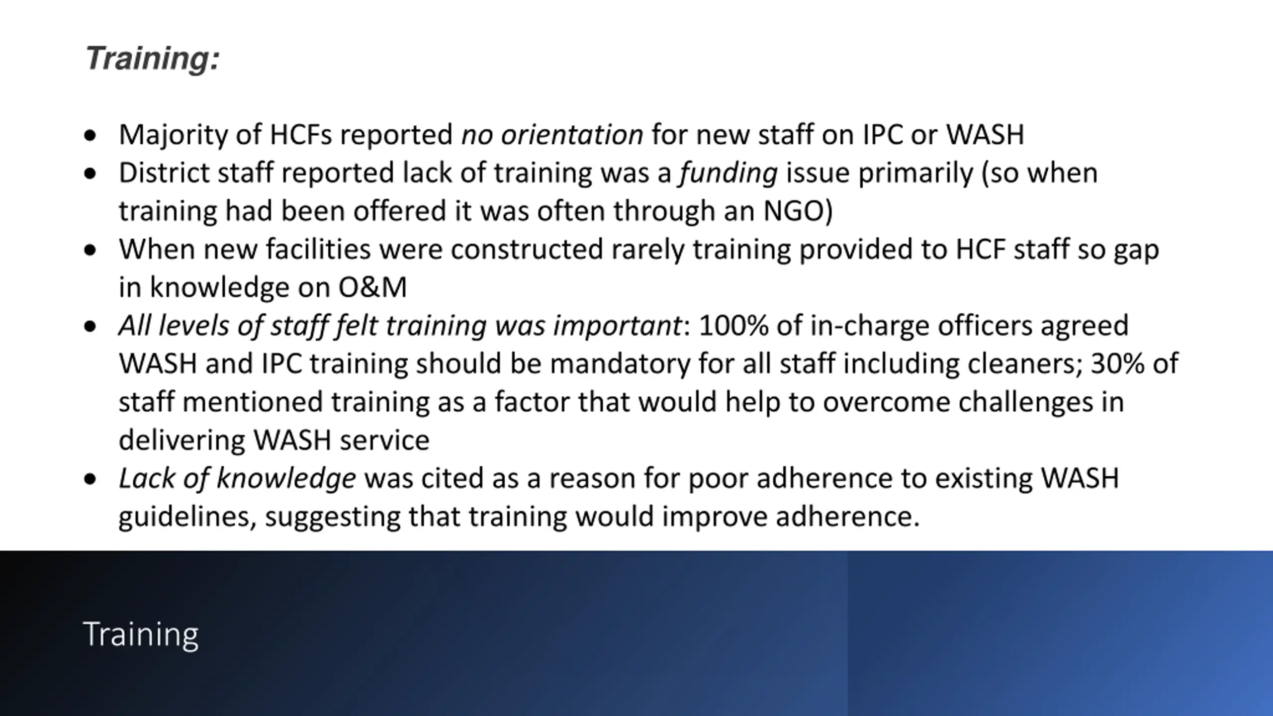 Training: Majority of HCFs reported no orientation for new staff on IPC or WASH District staff reported lack of training was a funding issue primarily (so when training had been offered it was often through an NGO) When new facilities were constructed rarely training provided to HCF staff so gap in knowledge on O&M All levels of staff felt training was important: 100% of in-charge officers agreed WASH and IPC training should be mandatory for all staff including cleaners; 30% of staff mentioned training as a factor that would help to overcome challenges in delivering WASH service Lack of knowledge was cited as a reason for poor adherence to existing WASH guidelines, suggesting that training would improve adherence. Training