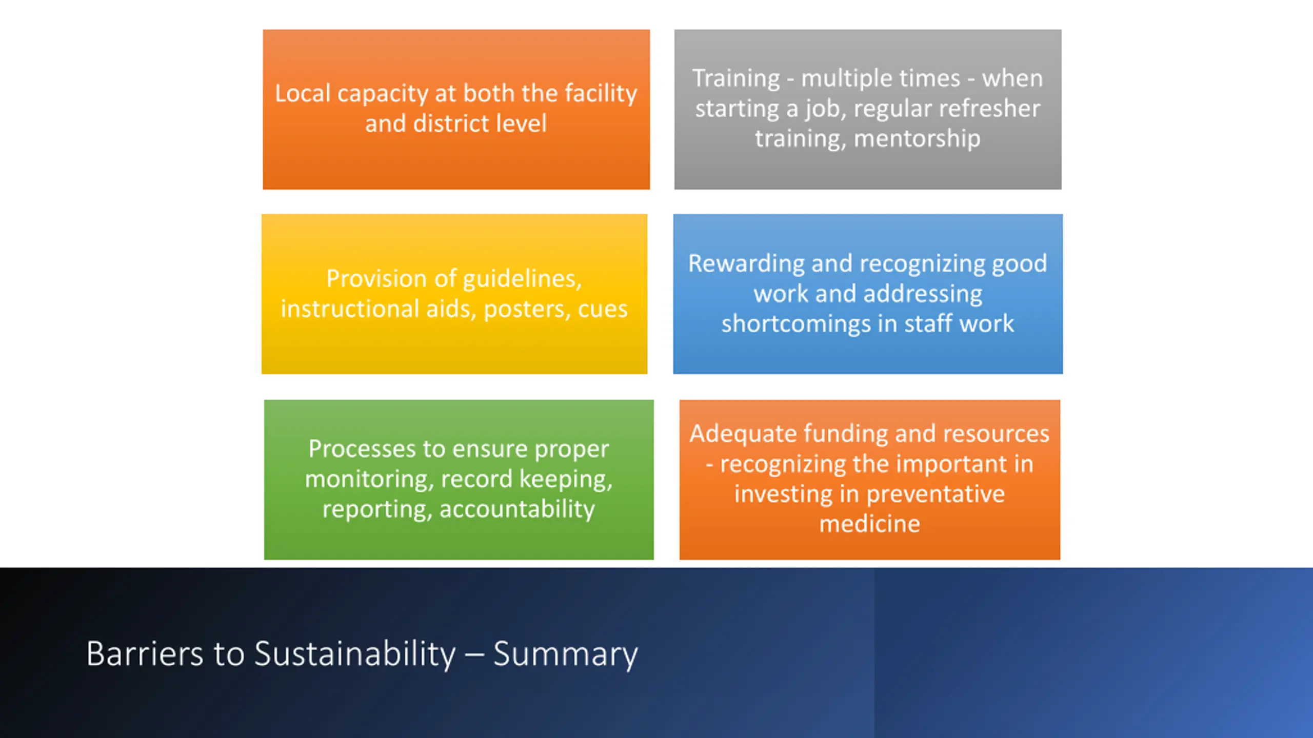 Training - multiple times - when starting a job, regular refresher training, mentorship Local capacity at both the facility and district level Rewarding and recognizing good work and addressing shortcomings in staff work Provision of guidelines, instructional aids, posters, cues Adequate funding and resources - recognizing the important in investing in preventative medicine Processes to ensure proper monitoring, record keeping, reporting, accountability Barriers to Sustainability Summary