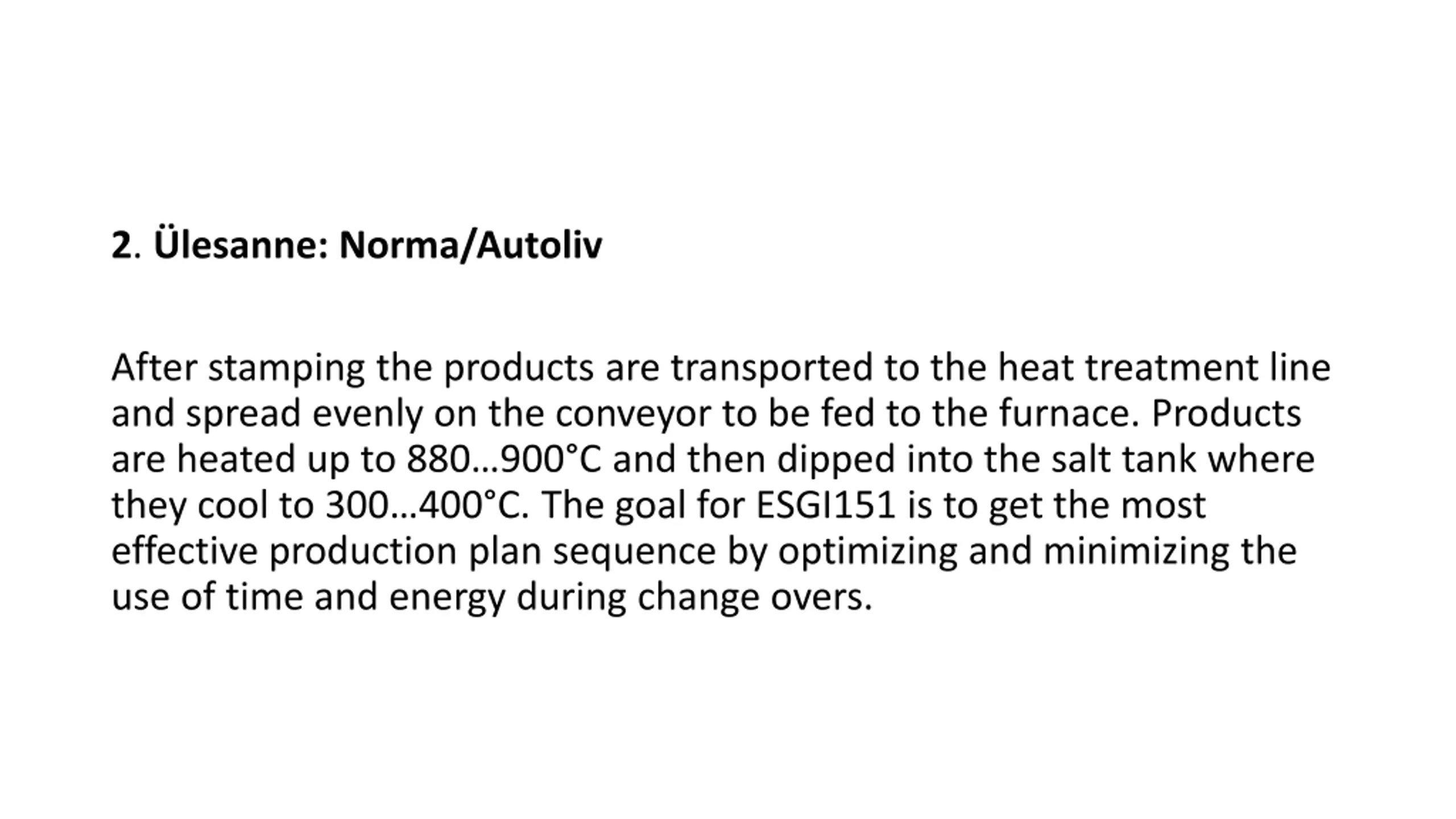 2. lesanne: Norma/Autoliv After stamping the products are transported to the heat treatment line and spread evenly on the conveyor to be fed to the furnace. Products are heated up to 880 900 C and then dipped into the salt tank where they cool to 300 400 C. The goal for ESGI151 is to get the most effective production plan sequence by optimizing and minimizing the use of time and energy during change overs.