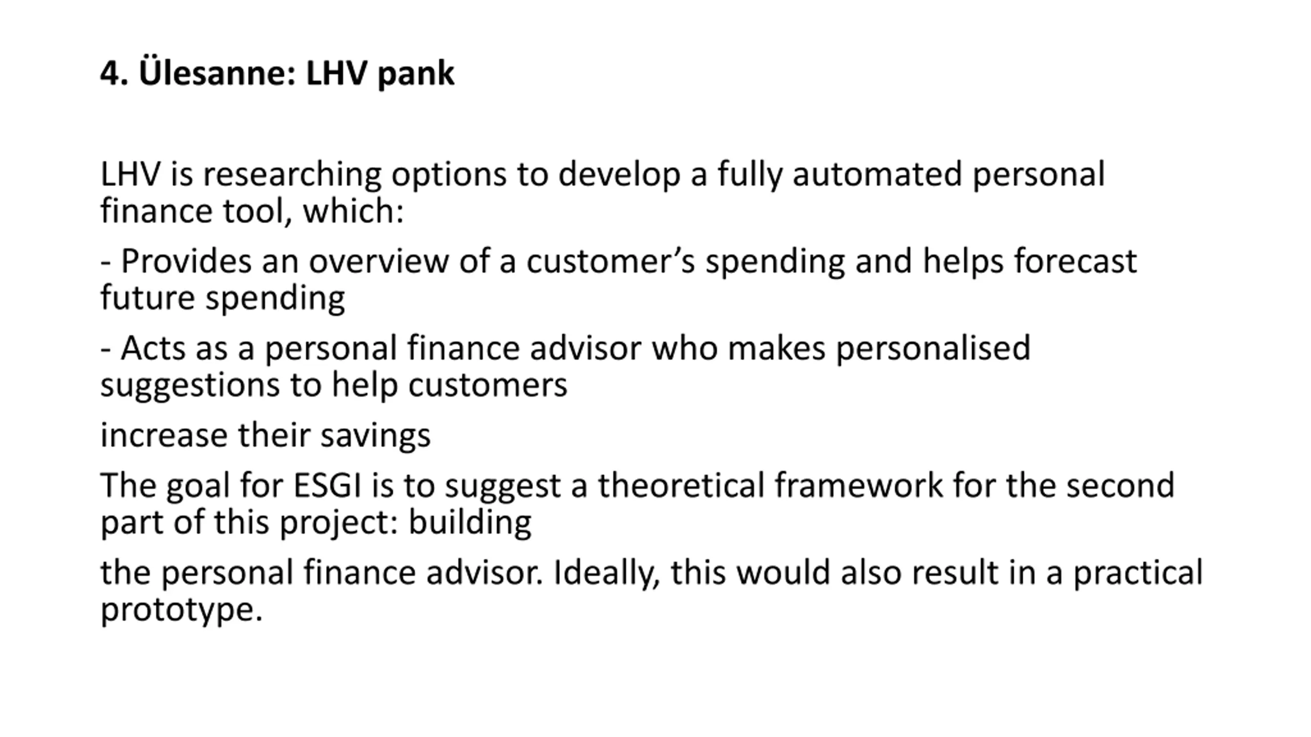 4. lesanne: LHV pank LHV is researching options to develop a fully automated personal finance tool, which: - Provides an overview of a customer s spending and helps forecast future spending - Acts as a personal finance advisor who makes personalised suggestions to help customers increase their savings The goal for ESGI is to suggest a theoretical framework for the second part of this project: building the personal finance advisor. Ideally, this would also result in a practical prototype.
