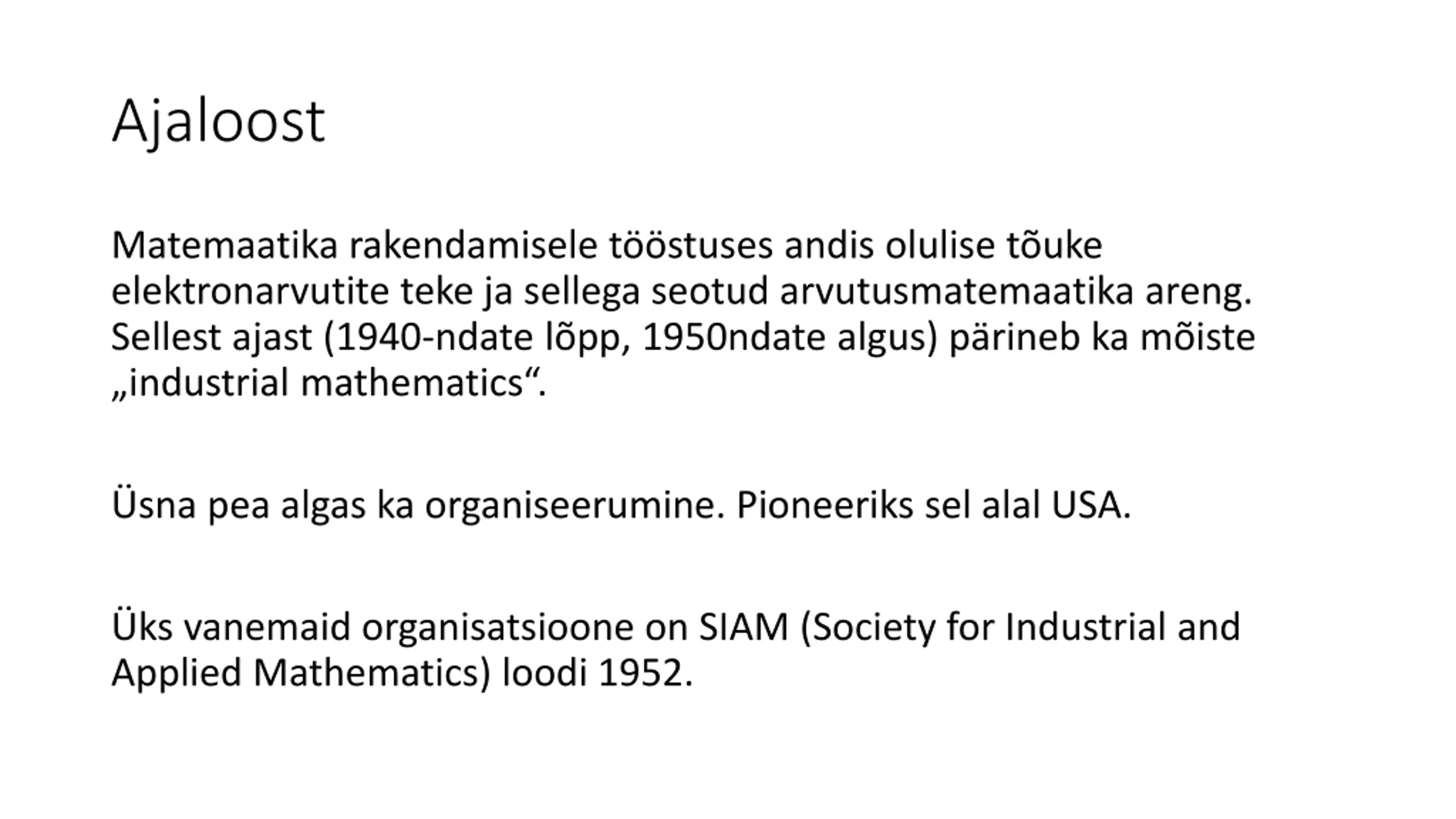 Ajaloost Matemaatika rakendamisele t stuses andis olulise t uke elektronarvutite teke ja sellega seotud arvutusmatemaatika areng. Sellest ajast (1940-ndate l pp, 1950ndate algus) p rineb ka m iste industrial mathematics . sna pea algas ka organiseerumine. Pioneeriks sel alal USA. ks vanemaid organisatsioone on SIAM (Society for Industrial and Applied Mathematics) loodi 1952.