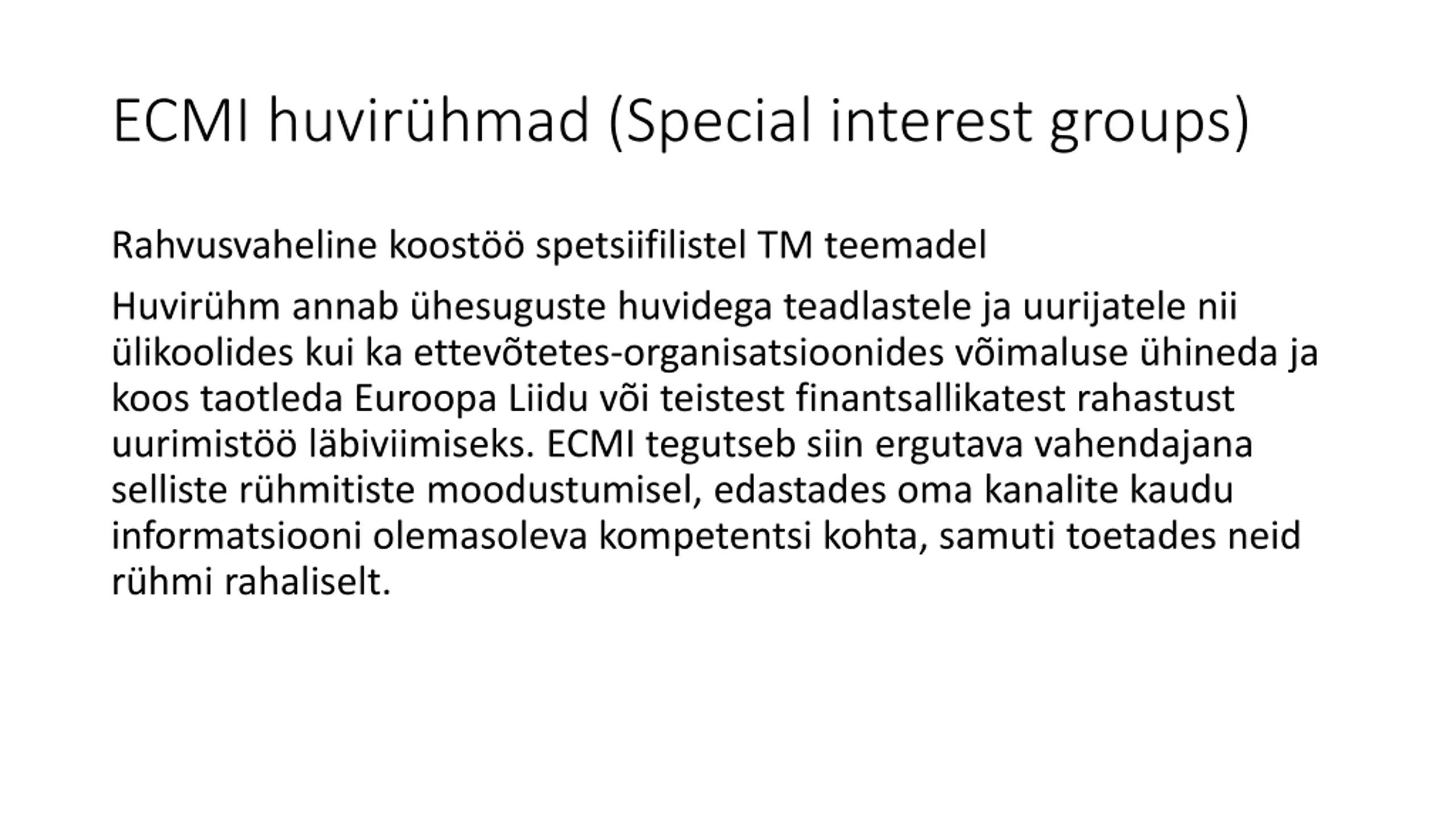 ECMI huvirhmad (Special interest groups) Rahvusvaheline koost spetsiifilistel TM teemadel Huvir hm annab hesuguste huvidega teadlastele ja uurijatele nii likoolides kui ka ettev tetes-organisatsioonides v imaluse hineda ja koos taotleda Euroopa Liidu v i teistest finantsallikatest rahastust uurimist l biviimiseks. ECMI tegutseb siin ergutava vahendajana selliste r hmitiste moodustumisel, edastades oma kanalite kaudu informatsiooni olemasoleva kompetentsi kohta, samuti toetades neid r hmi rahaliselt.