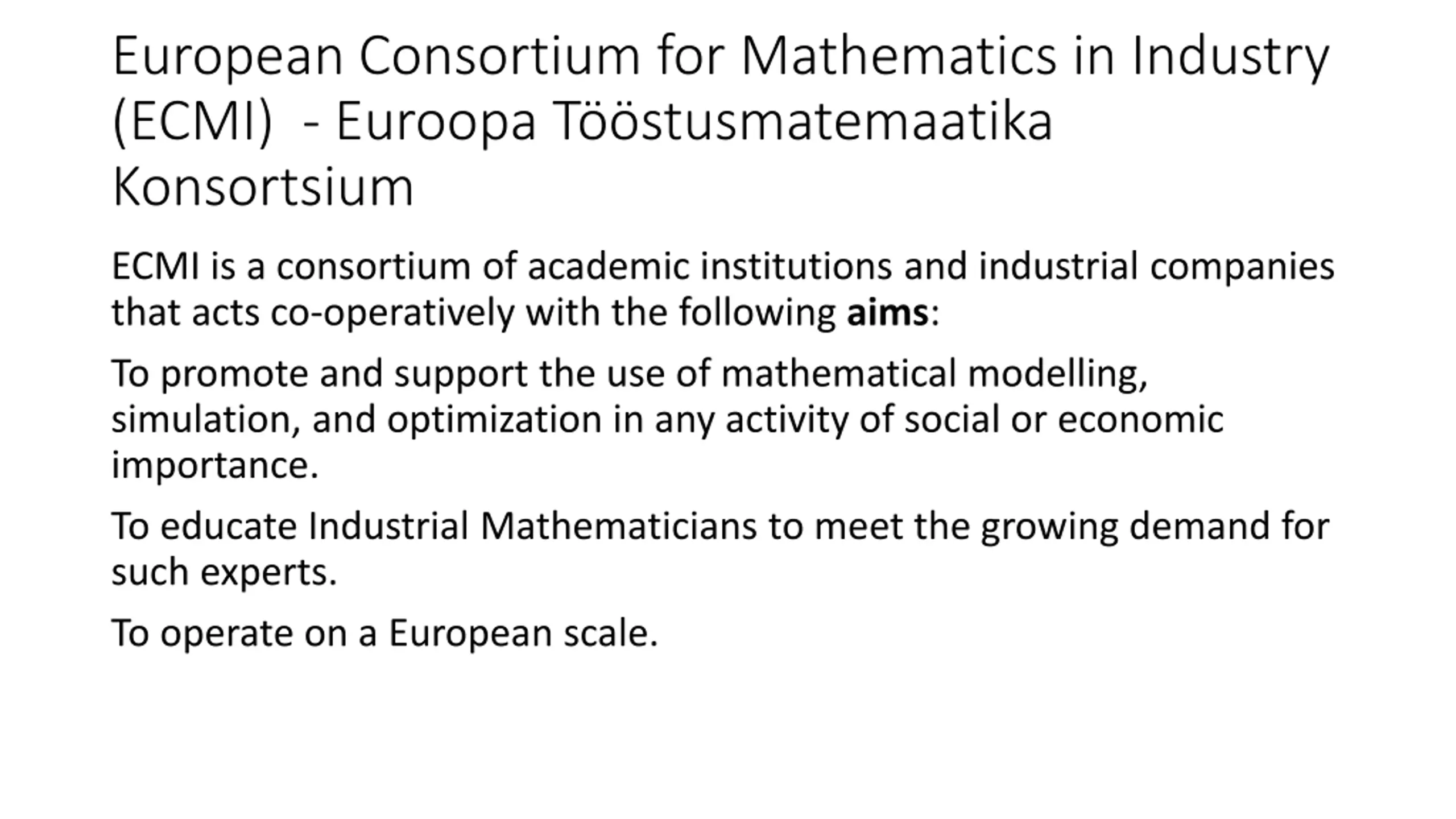 European Consortium for Mathematics in Industry (ECMI) - Euroopa T stusmatemaatika Konsortsium ECMI is a consortium of academic institutions and industrial companies that acts co-operatively with the following aims: To promote and support the use of mathematical modelling, simulation, and optimization in any activity of social or economic importance. To educate Industrial Mathematicians to meet the growing demand for such experts. To operate on a European scale.