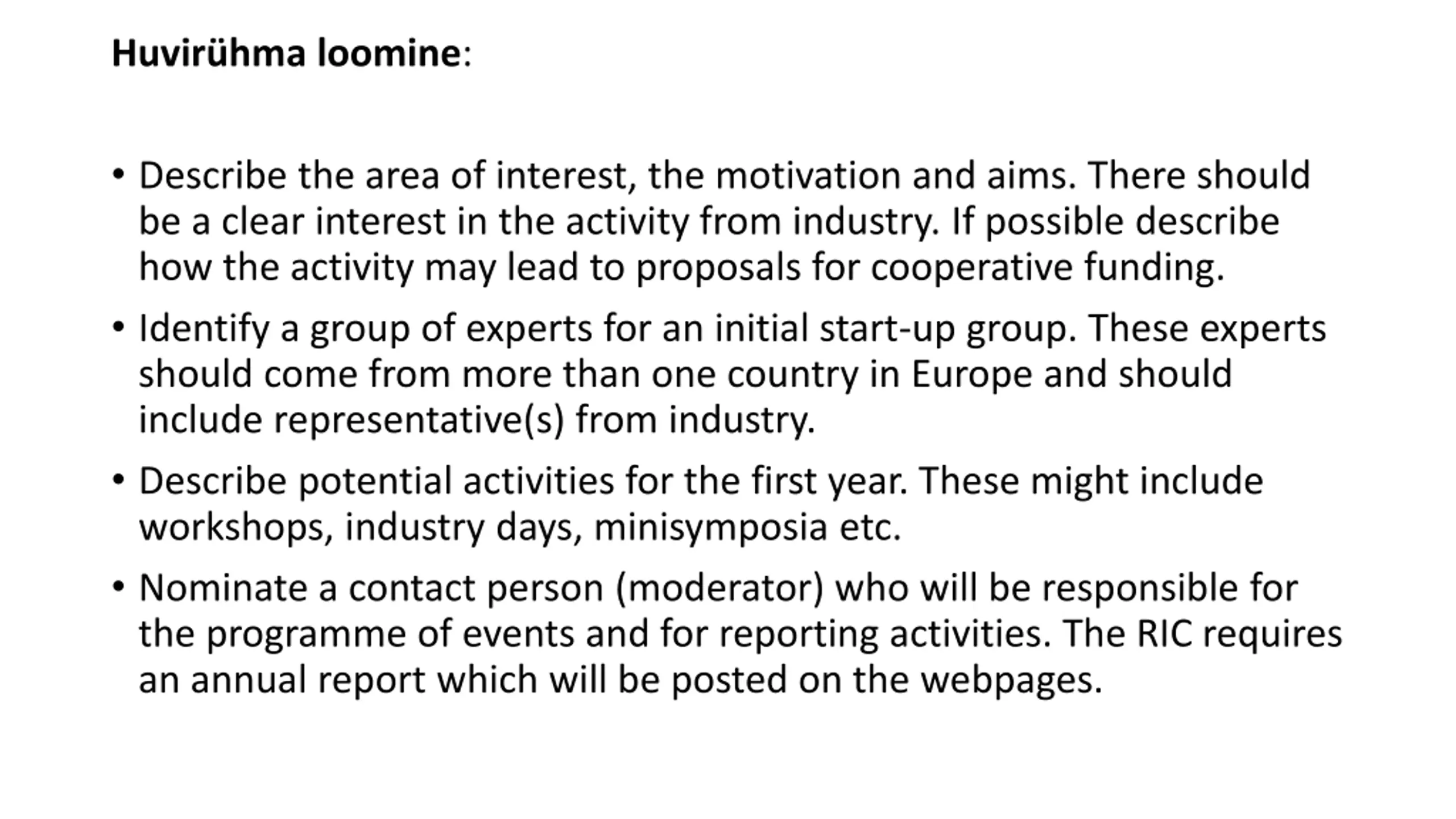 Huvirhma loomine: Describe the area of interest, the motivation and aims. There should be a clear interest in the activity from industry. If possible describe how the activity may lead to proposals for cooperative funding. Identify a group of experts for an initial start-up group. These experts should come from more than one country in Europe and should include representative(s) from industry. Describe potential activities for the first year. These might include workshops, industry days, minisymposia etc. Nominate a contact person (moderator) who will be responsible for the programme of events and for reporting activities. The RIC requires an annual report which will be posted on the webpages.