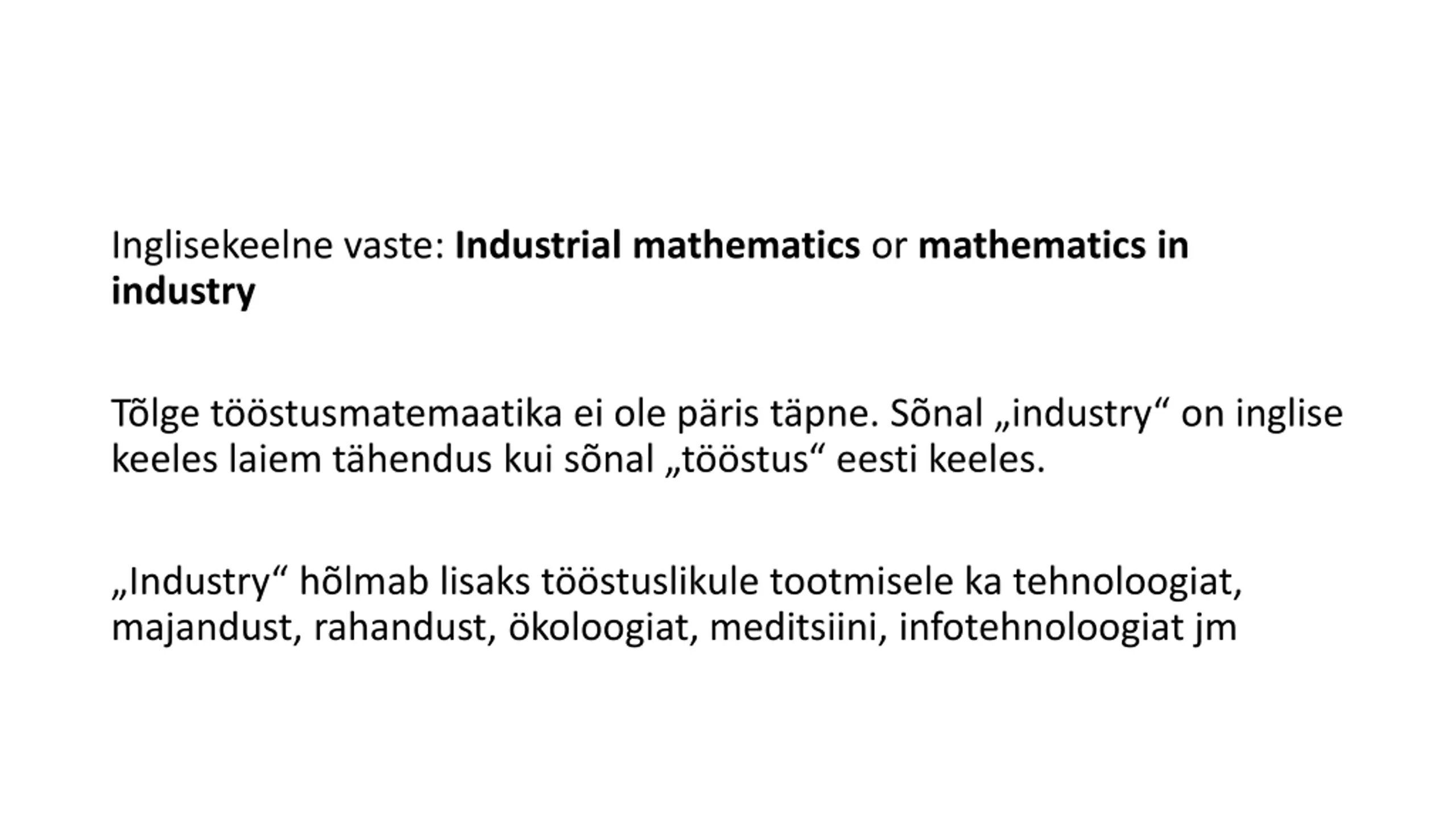 Inglisekeelne vaste: Industrial mathematics or mathematics in industry T lge t stusmatemaatika ei ole p ris t pne. S nal industry on inglise keeles laiem t hendus kui s nal t stus eesti keeles. Industry h lmab lisaks t stuslikule tootmisele ka tehnoloogiat, majandust, rahandust, koloogiat, meditsiini, infotehnoloogiat jm