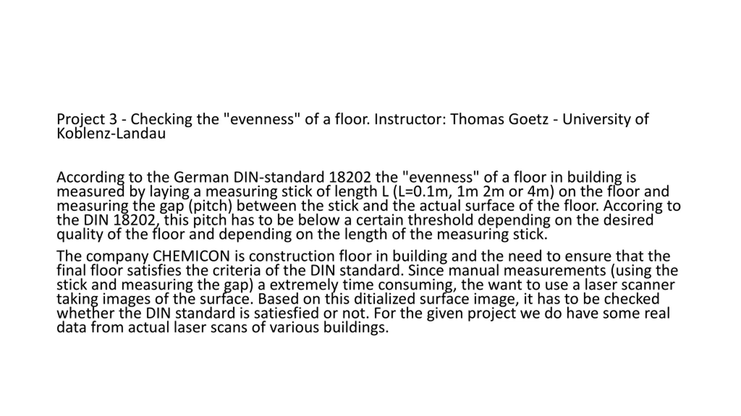 Project 3 - Checking the "evenness" of a floor. Instructor: Thomas Goetz - University of Koblenz-Landau According to the German DIN-standard 18202 the "evenness" of a floor in building is measured by laying a measuring stick of length L (L=0.1m, 1m 2m or 4m) on the floor and measuring the gap (pitch) between the stick and the actual surface of the floor. Accoring to the DIN 18202, this pitch has to be below a certain threshold depending on the desired quality of the floor and depending on the length of the measuring stick. The company CHEMICON is construction floor in building and the need to ensure that the final floor satisfies the criteria of the DIN standard. Since manual measurements (using the stick and measuring the gap) a extremely time consuming, the want to use a laser scanner taking images of the surface. Based on this ditialized surface image, it has to be checked whether the DIN standard is satiesfied or not. For the given project we do have some real data from actual laser scans of various buildings.