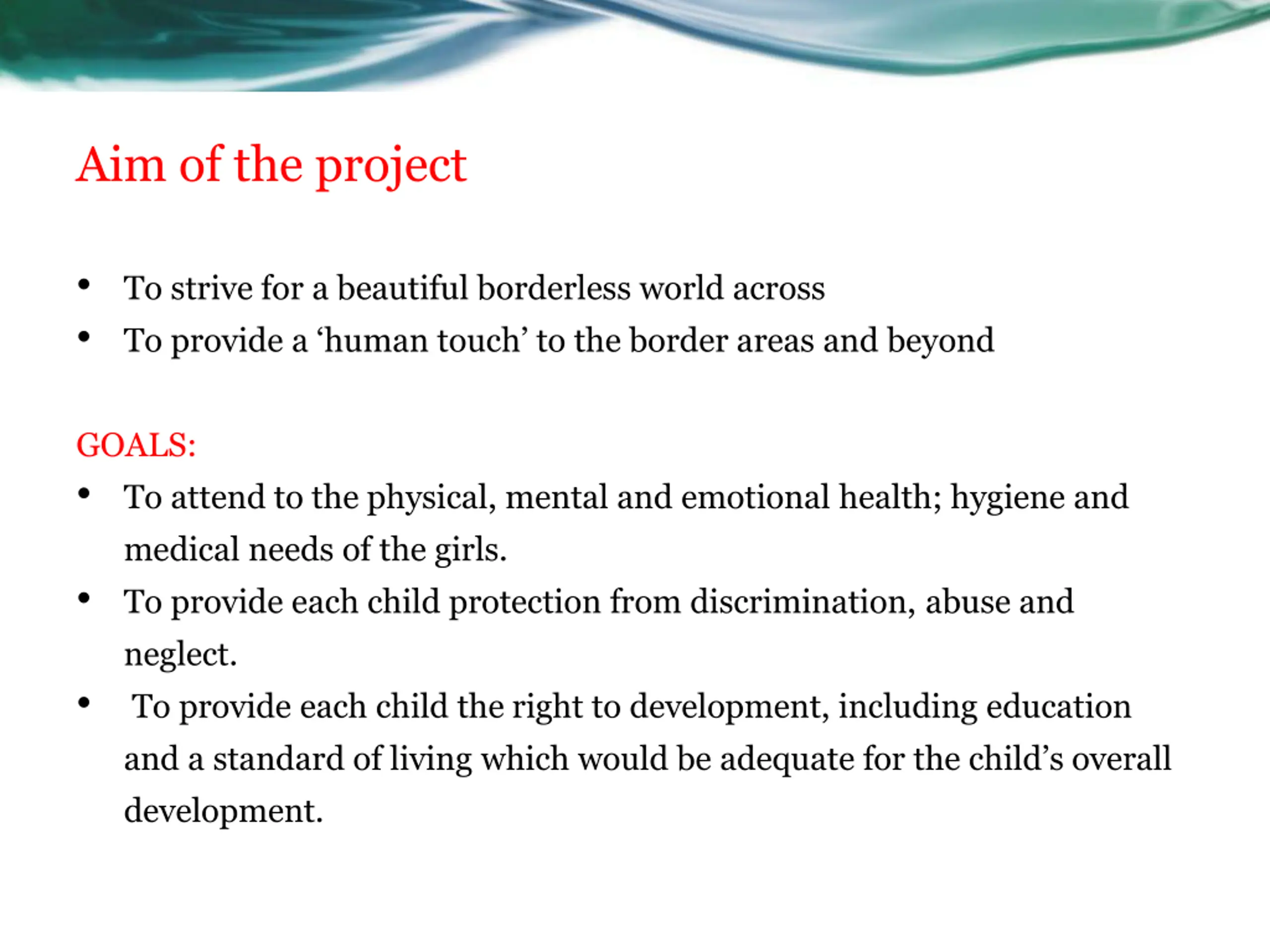 Aim of the project To strive for a beautiful borderless world across To provide a human touch to the border areas and beyond GOALS: To attend to the physical, mental and emotional health; hygiene and medical needs of the girls. To provide each child protection from discrimination, abuse and neglect. To provide each child the right to development, including education and a standard of living which would be adequate for the child s overall development.