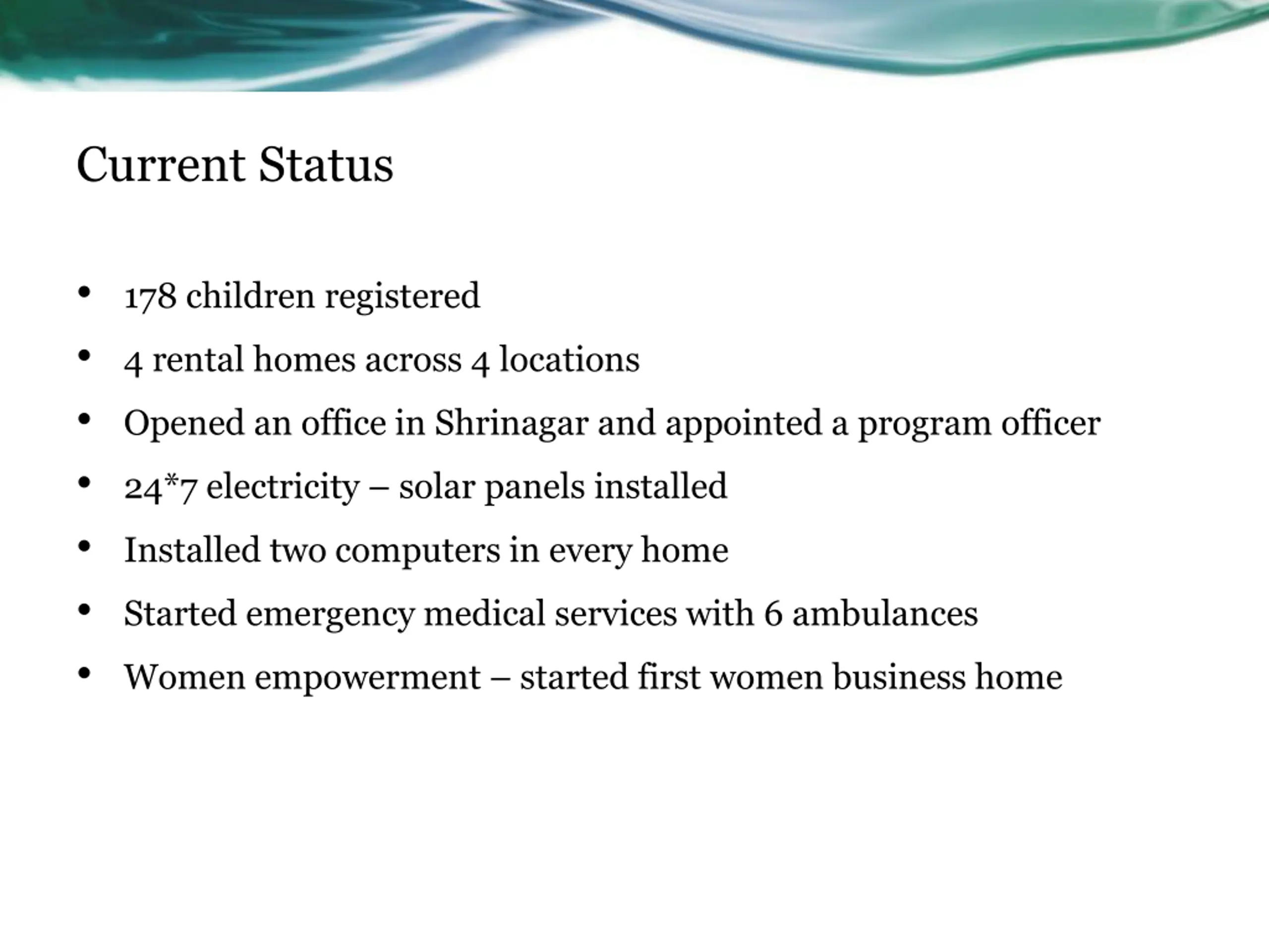 Current Status 178 children registered 4 rental homes across 4 locations Opened an office in Shrinagar and appointed a program officer 24*7 electricity solar panels installed Installed two computers in every home Started emergency medical services with 6 ambulances Women empowerment started first women business home