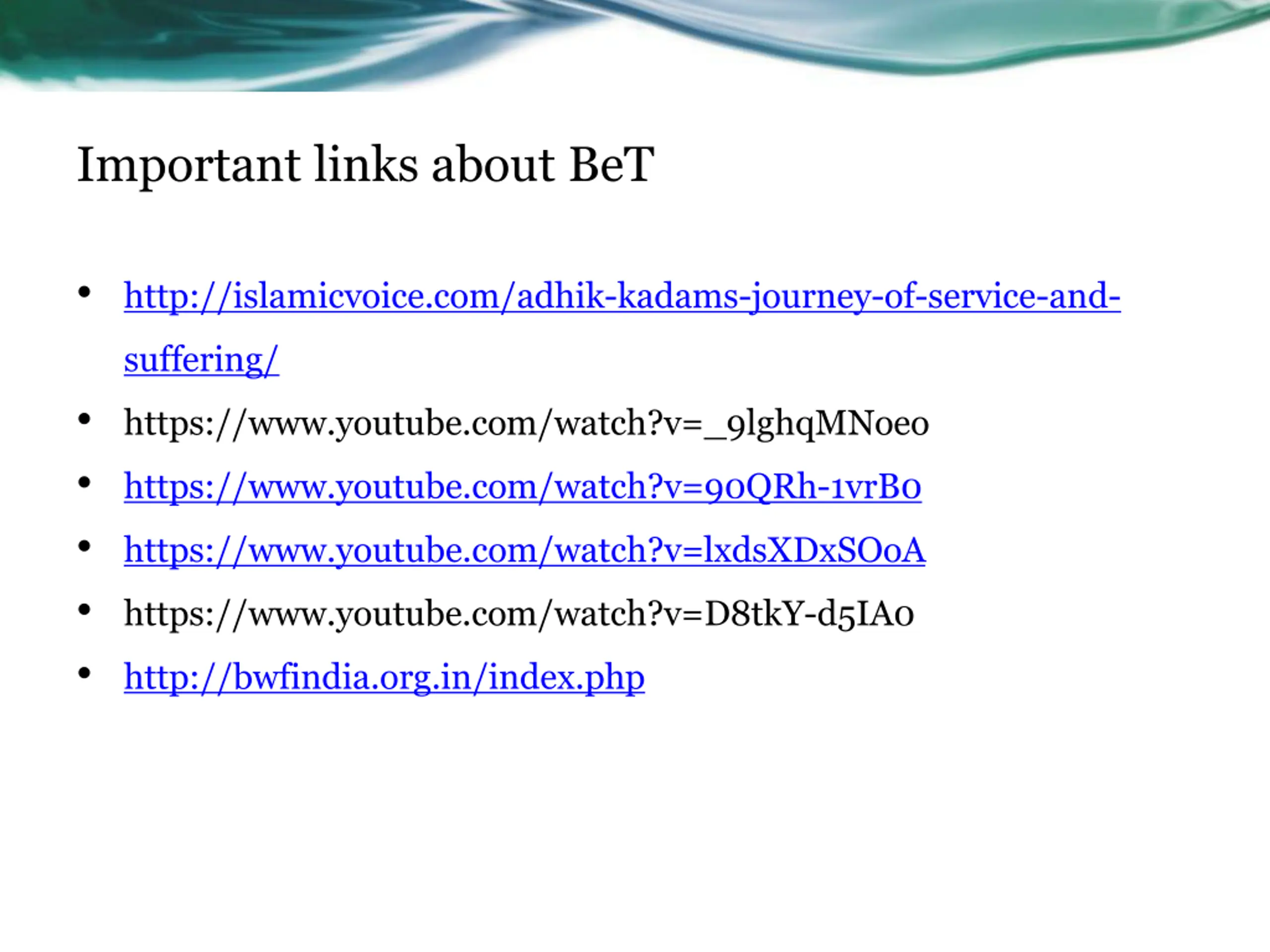 Important links about BeT http://islamicvoice.com/adhik-kadams-journey-of-service-and- suffering/ https://www.youtube.com/watch?v=_9lghqMNoeo https://www.youtube.com/watch?v=90QRh-1vrB0 https://www.youtube.com/watch?v=lxdsXDxSOoA https://www.youtube.com/watch?v=D8tkY-d5IA0 http://bwfindia.org.in/index.php