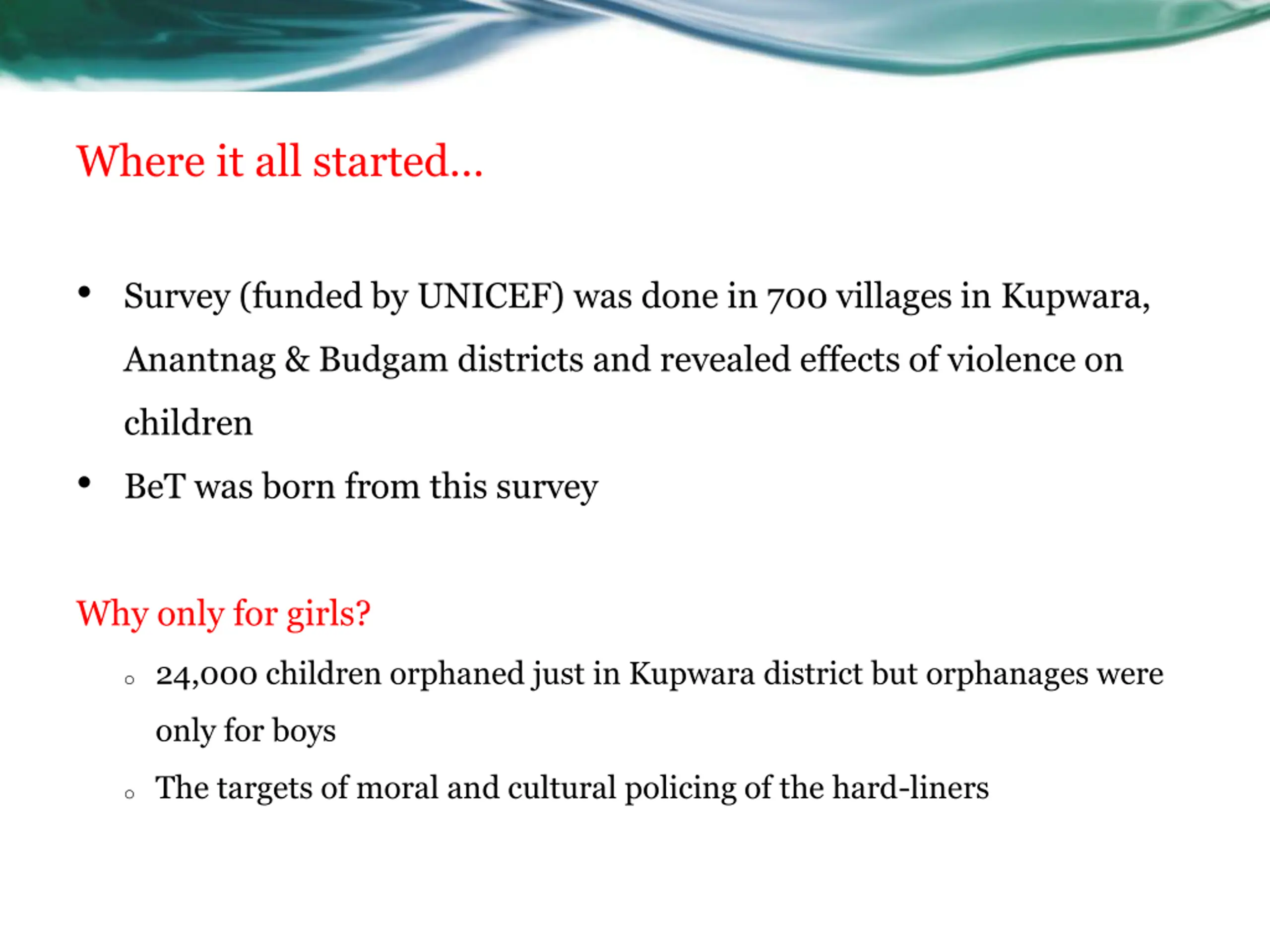 Where it all started Survey (funded by UNICEF) was done in 700 villages in Kupwara, Anantnag & Budgam districts and revealed effects of violence on children BeT was born from this survey Why only for girls? o 24,000 children orphaned just in Kupwara district but orphanages were only for boys o The targets of moral and cultural policing of the hard-liners