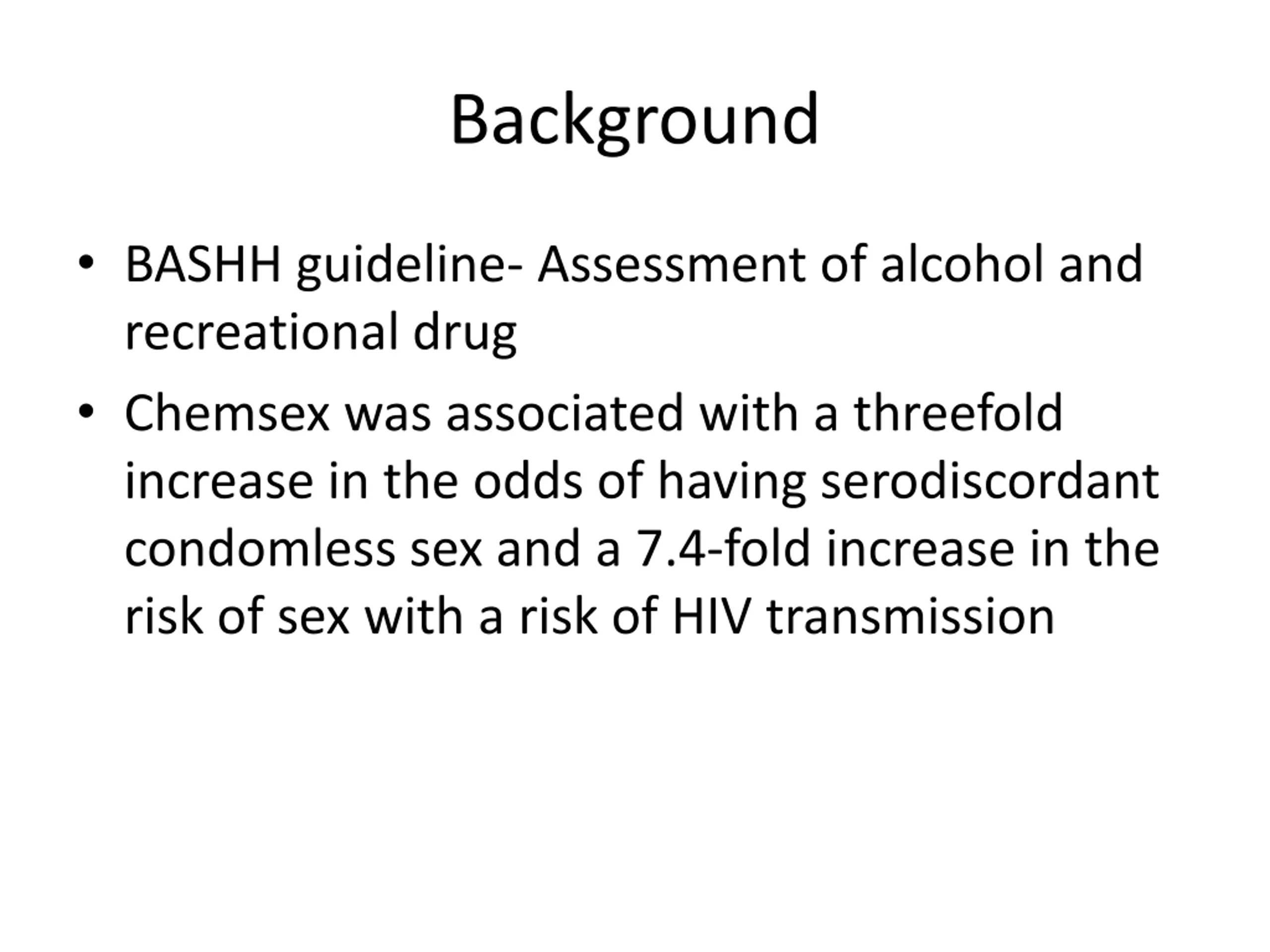 Background BASHH guideline- Assessment of alcohol and recreational drug Chemsex was associated with a threefold increase in the odds of having serodiscordant condomless sex and a 7.4-fold increase in the risk of sex with a risk of HIV transmission