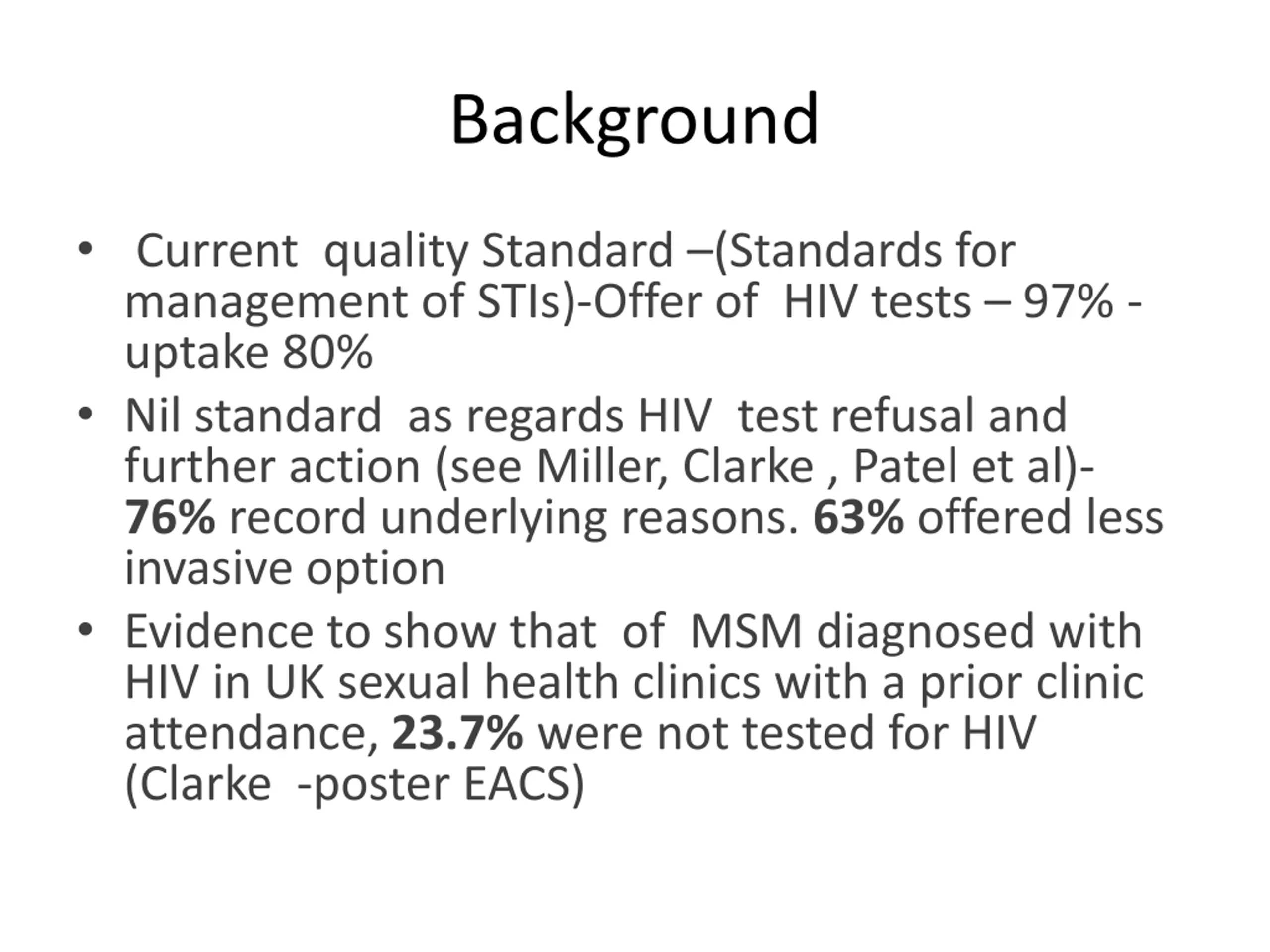 Background Current quality Standard (Standards for management of STIs)-Offer of HIV tests 97% - uptake 80% Nil standard as regards HIV test refusal and further action (see Miller, Clarke , Patel et al)- 76% record underlying reasons. 63% offered less invasive option Evidence to show that of MSM diagnosed with HIV in UK sexual health clinics with a prior clinic attendance, 23.7% were not tested for HIV (Clarke -poster EACS)