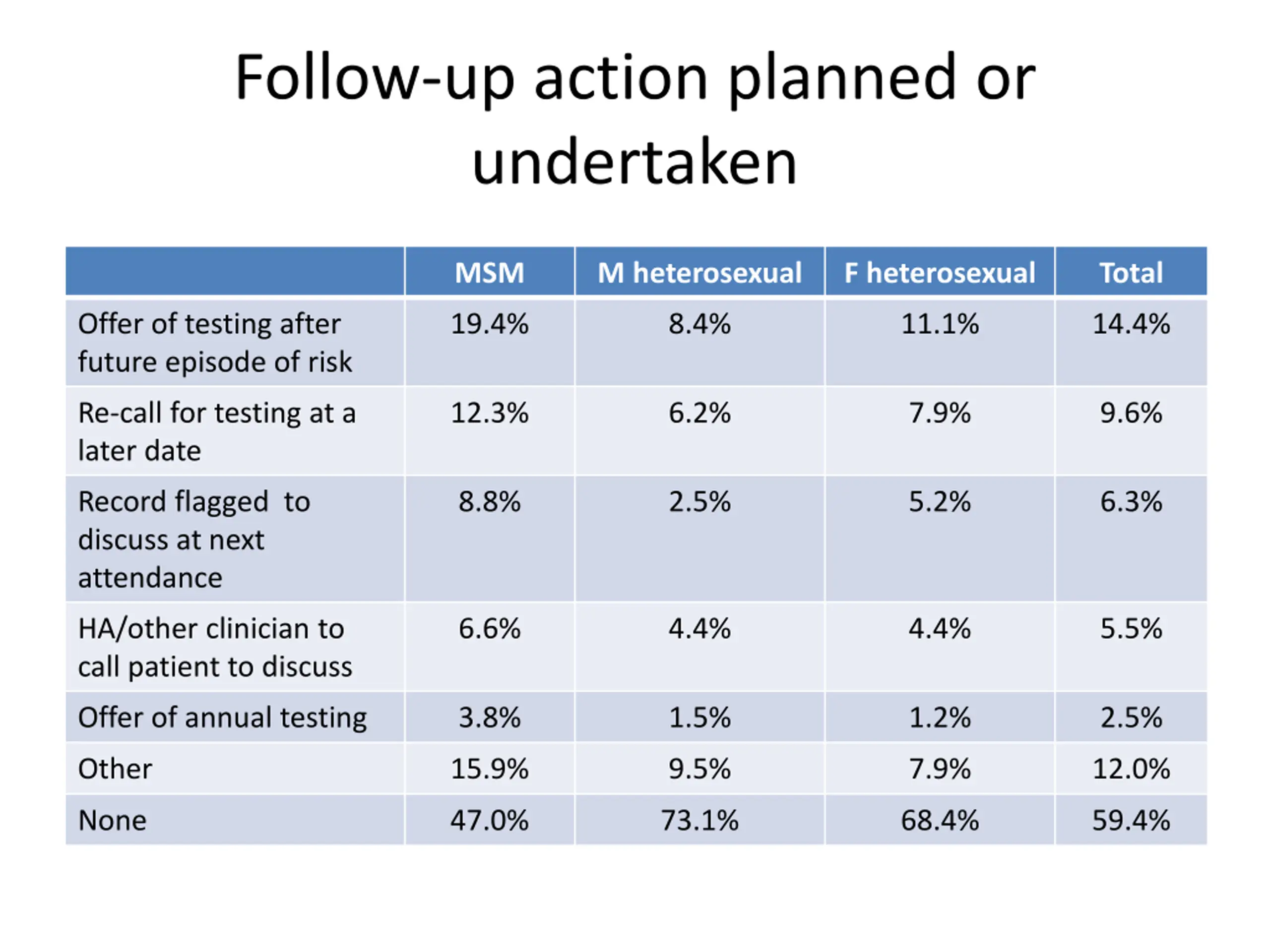Follow-up action planned or undertaken MSM M heterosexual F heterosexual Total Offer of testing after future episode of risk 19.4% 8.4% 11.1% 14.4% Re-call for testing at a later date 12.3% 6.2% 7.9% 9.6% Record flagged to discuss at next attendance 8.8% 2.5% 5.2% 6.3% HA/other clinician to call patient to discuss 6.6% 4.4% 4.4% 5.5% Offer of annual testing 3.8% 1.5% 1.2% 2.5% Other 15.9% 9.5% 7.9% 12.0% None 47.0% 73.1% 68.4% 59.4%