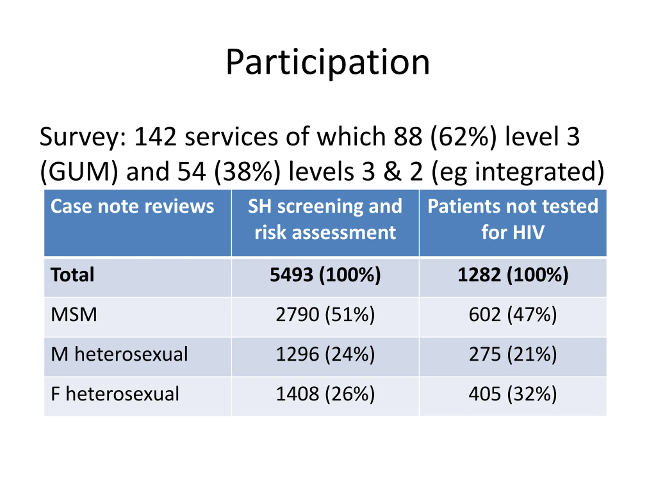 Participation Survey: 142 services of which 88 (62%) level 3 (GUM) and 54 (38%) levels 3 & 2 (eg integrated) Case note reviews SH screening and risk assessment Patients not tested for HIV Total 5493 (100%) 1282 (100%) MSM 2790 (51%) 602 (47%) M heterosexual 1296 (24%) 275 (21%) F heterosexual 1408 (26%) 405 (32%)