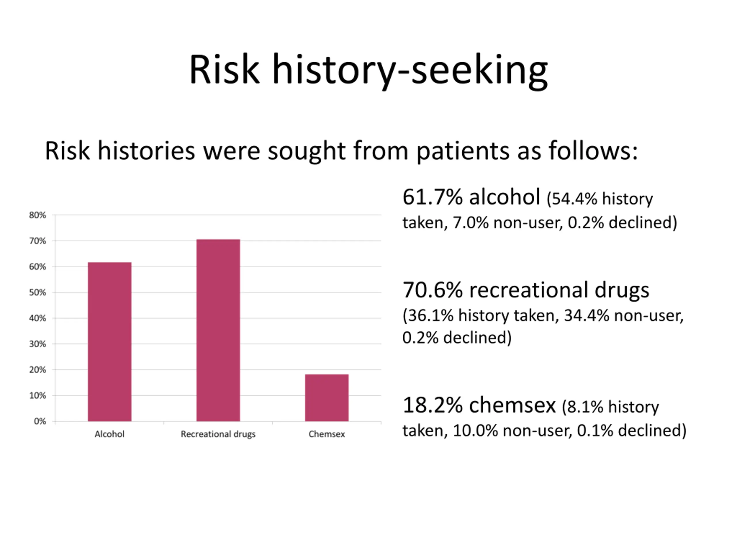 Risk history-seeking Risk histories were sought from patients as follows: 61.7% alcohol (54.4% history taken, 7.0% non-user, 0.2% declined) 70.6% recreational drugs (36.1% history taken, 34.4% non-user, 0.2% declined) 18.2% chemsex (8.1% history taken, 10.0% non-user, 0.1% declined)