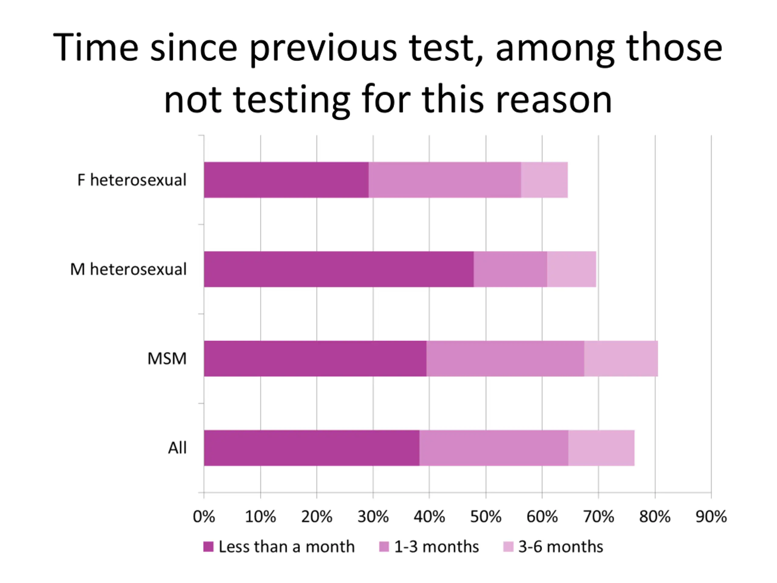 Window period Of 119 individuals not tested because of recent exposure in window period , last exposure was: 106 (89.1%) less than 4 weeks previously 9 (7.6%) 4-8 weeks previously. However, 21 (17.6%) had other earlier risk(s) of HIV not covered by a previous test (12/21- MSM). 5 of these 21 also had other reasons given (recent previous test or did not wish to be tested for HIV).