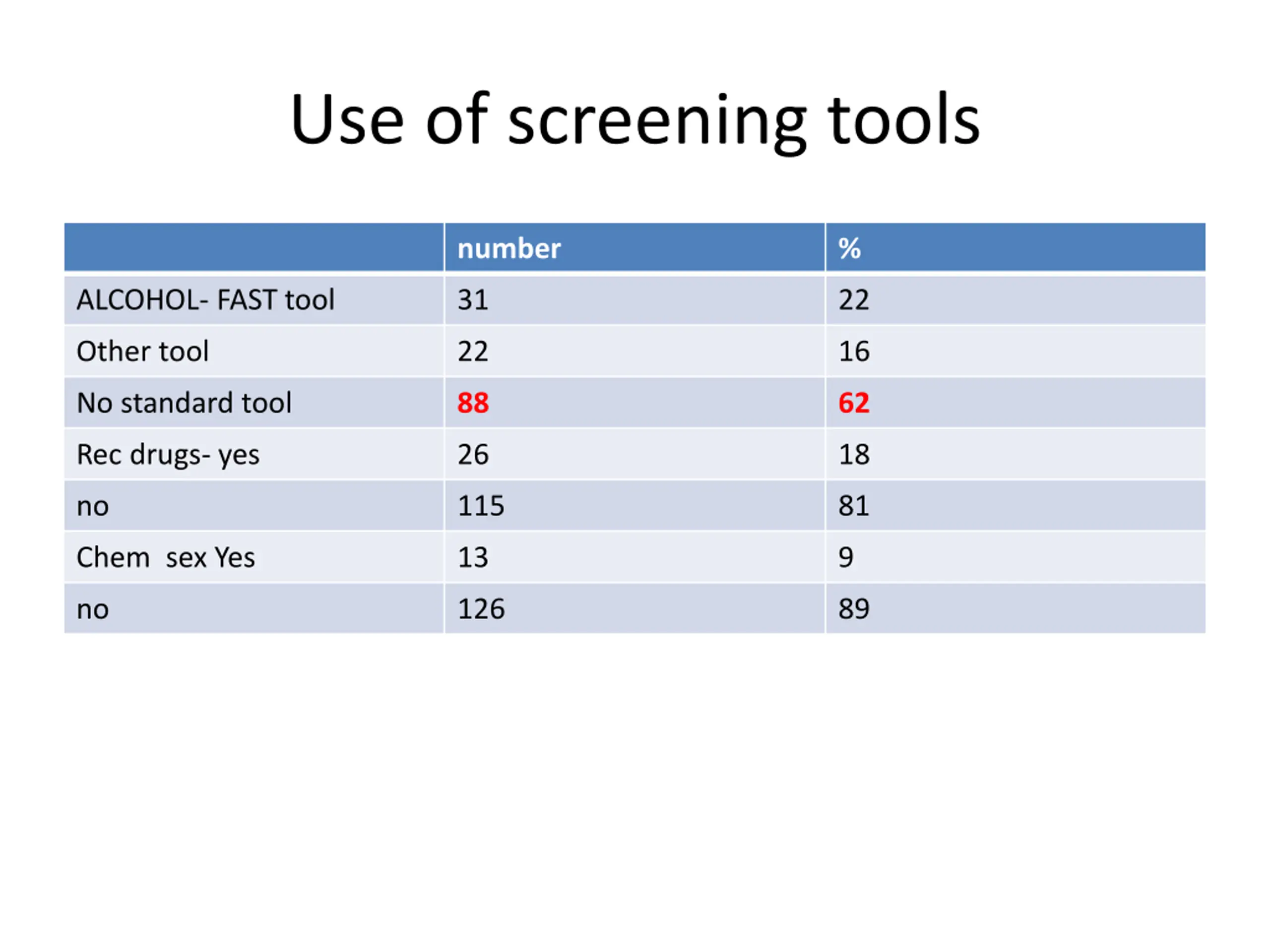 Use of screening tools number % ALCOHOL- FAST tool 31 22 Other tool 22 16 No standard tool 88 62 Rec drugs- yes 26 18 no 115 81 Chem sex Yes 13 9 no 126 89