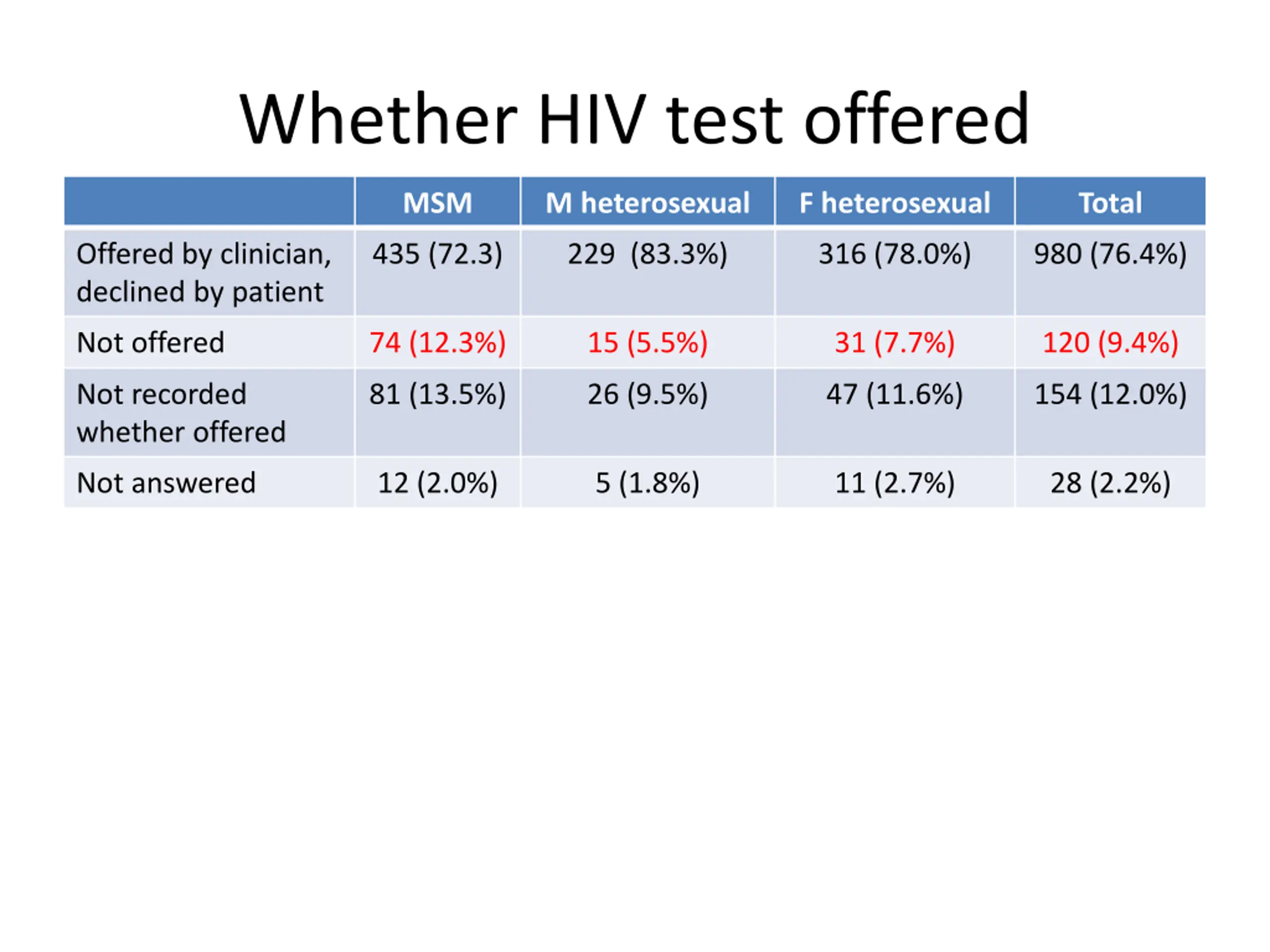 Whether HIV test offered MSM M heterosexual F heterosexual Total Offered by clinician, declined by patient 435 (72.3) 229 (83.3%) 316 (78.0%) 980 (76.4%) Not offered 74 (12.3%) 15 (5.5%) 31 (7.7%) 120 (9.4%) Not recorded whether offered 81 (13.5%) 26 (9.5%) 47 (11.6%) 154 (12.0%) Not answered 12 (2.0%) 5 (1.8%) 11 (2.7%) 28 (2.2%)