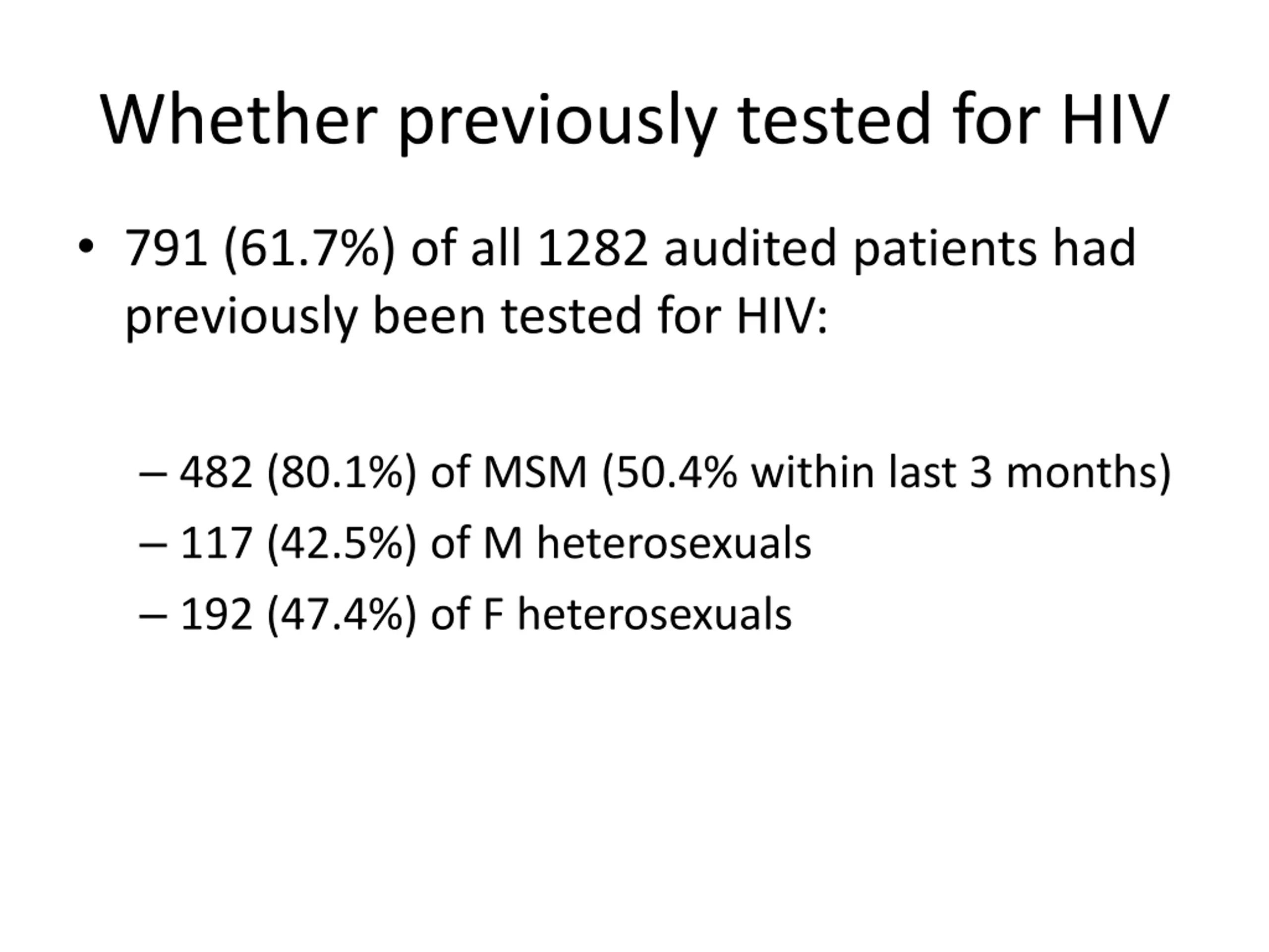 Whether previously tested for HIV 791 (61.7%) of all 1282 audited patients had previously been tested for HIV: 482 (80.1%) of MSM (50.4% within last 3 months) 117 (42.5%) of M heterosexuals 192 (47.4%) of F heterosexuals