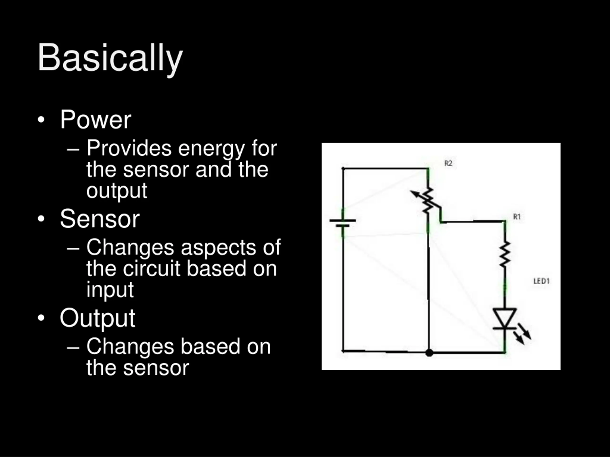 Basically Power Provides energy for the sensor and the output Sensor Changes aspects of the circuit based on input Output Changes based on the sensor