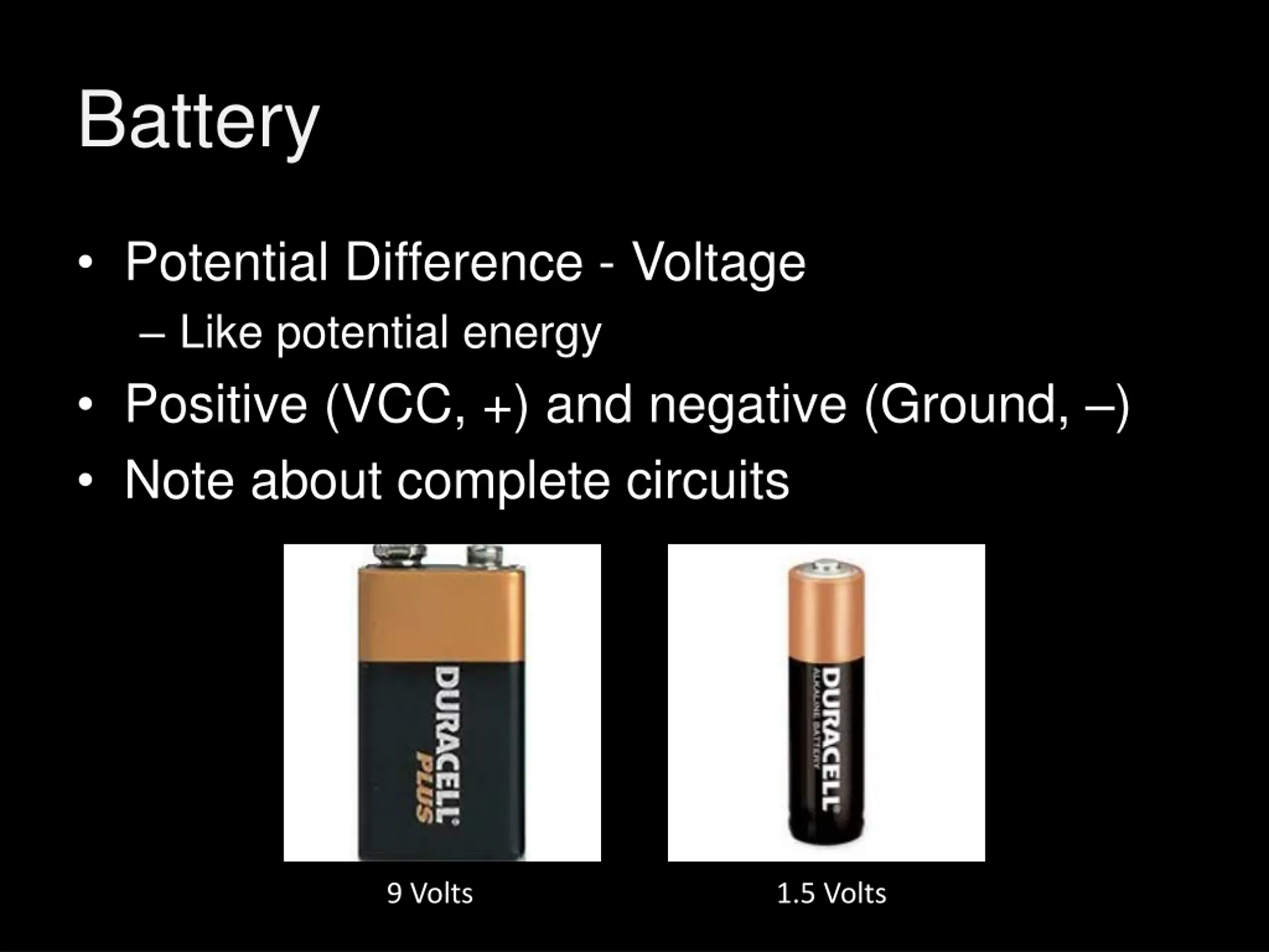 Battery Potential Difference - Voltage Like potential energy Positive (VCC, +) and negative (Ground, ) Note about complete circuits 9 Volts 1.5 Volts