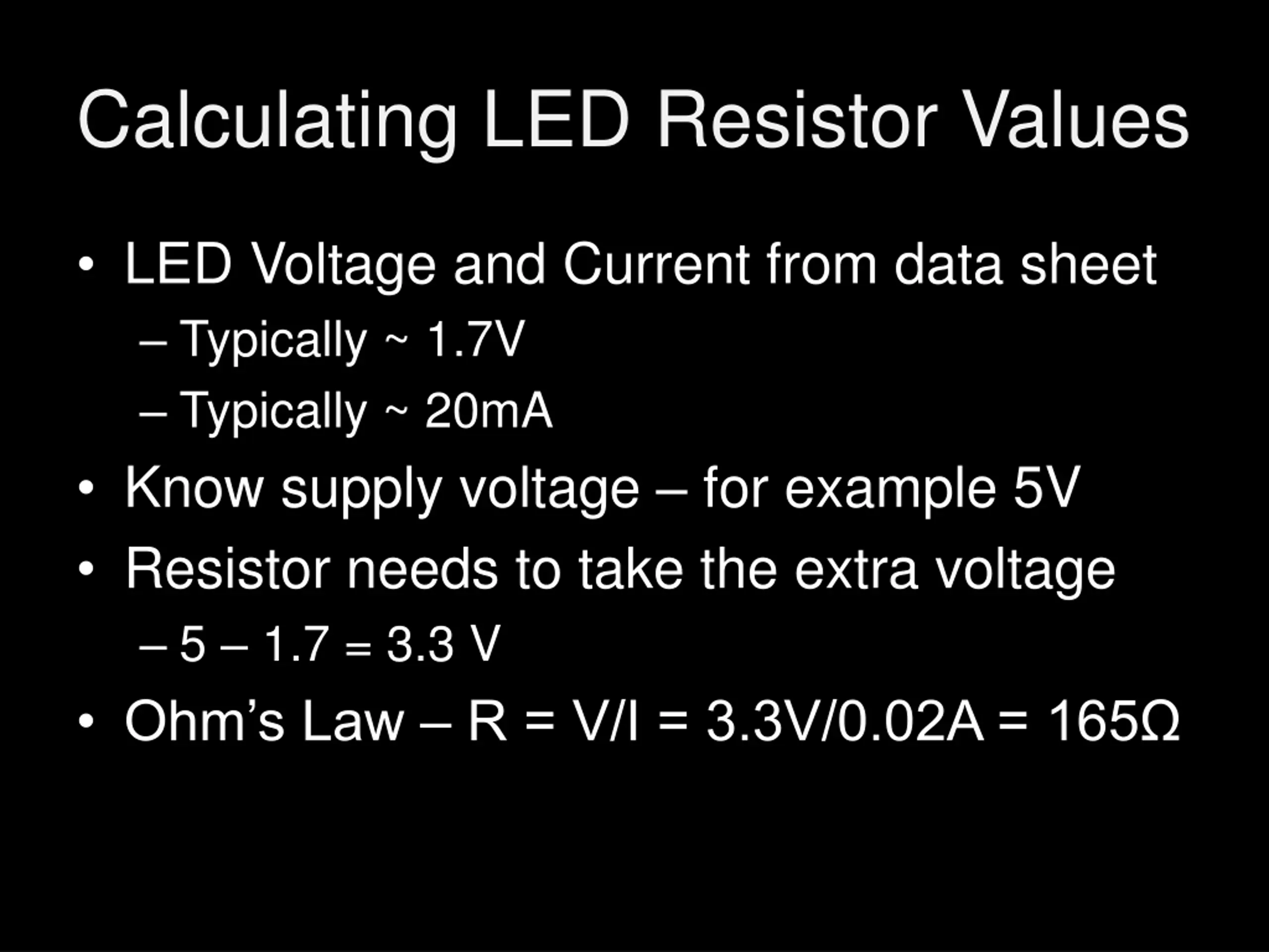 Calculating LED Resistor Values LED Voltage and Current from data sheet Typically ~ 1.7V Typically ~ 20mA Know supply voltage for example 5V Resistor needs to take the extra voltage 5 1.7 = 3.3 V Ohm s Law R = V/I = 3.3V/0.02A = 165