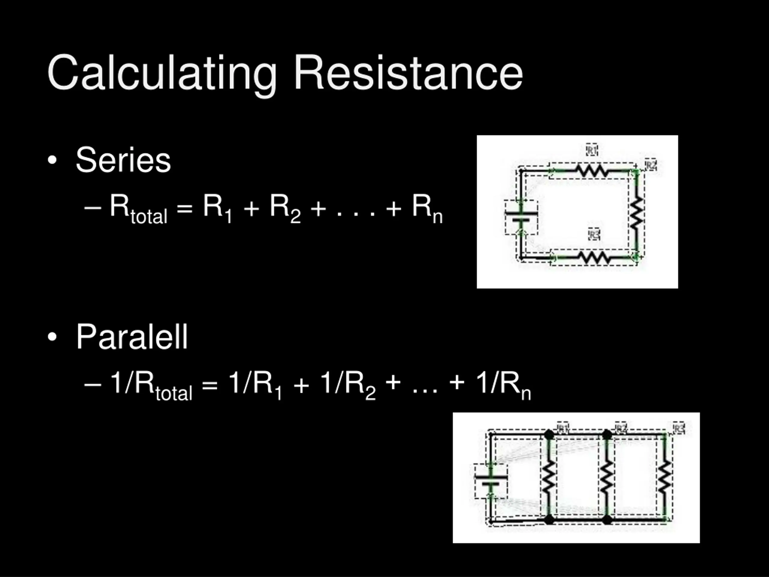 Calculating Resistance Series Rtotal = R1 + R2 + . . . + Rn Paralell 1/Rtotal = 1/R1 + 1/R2+ + 1/Rn