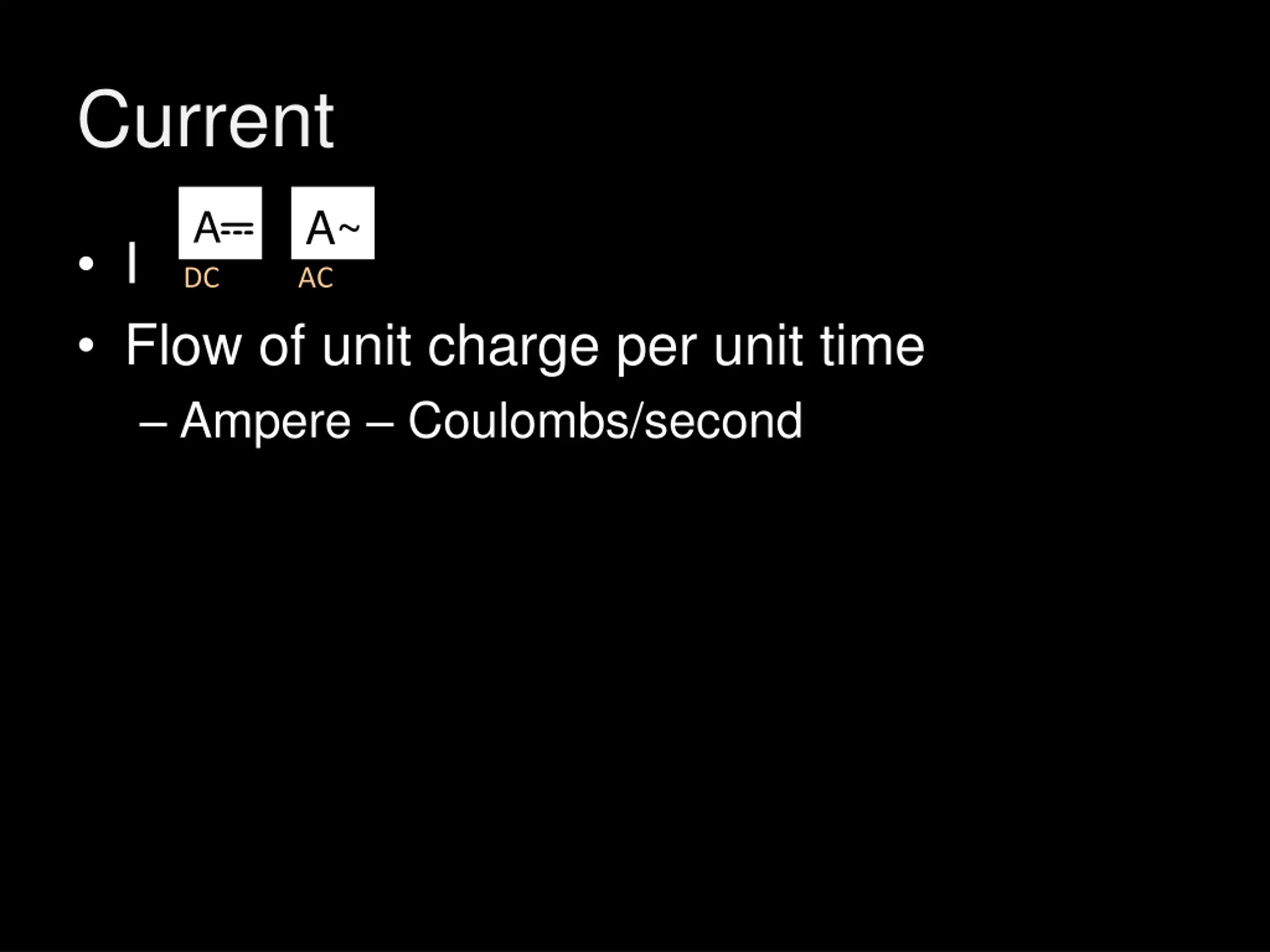 Current A~ AC A DC I Flow of unit charge per unit time Ampere Coulombs/second