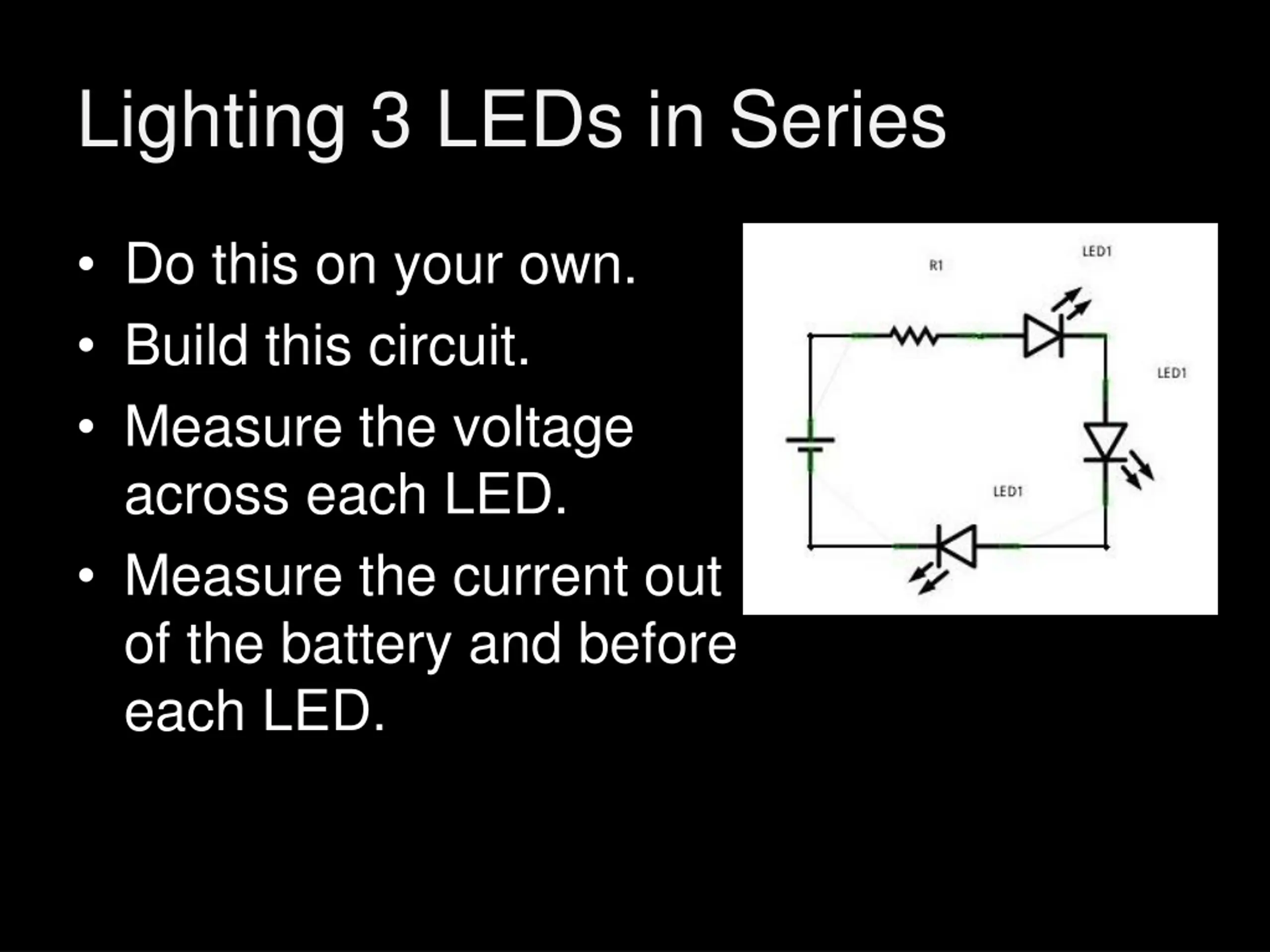 Lighting 3 LEDs in Series Do this on your own. Build this circuit. Measure the voltage across each LED. Measure the current out of the battery and before each LED.