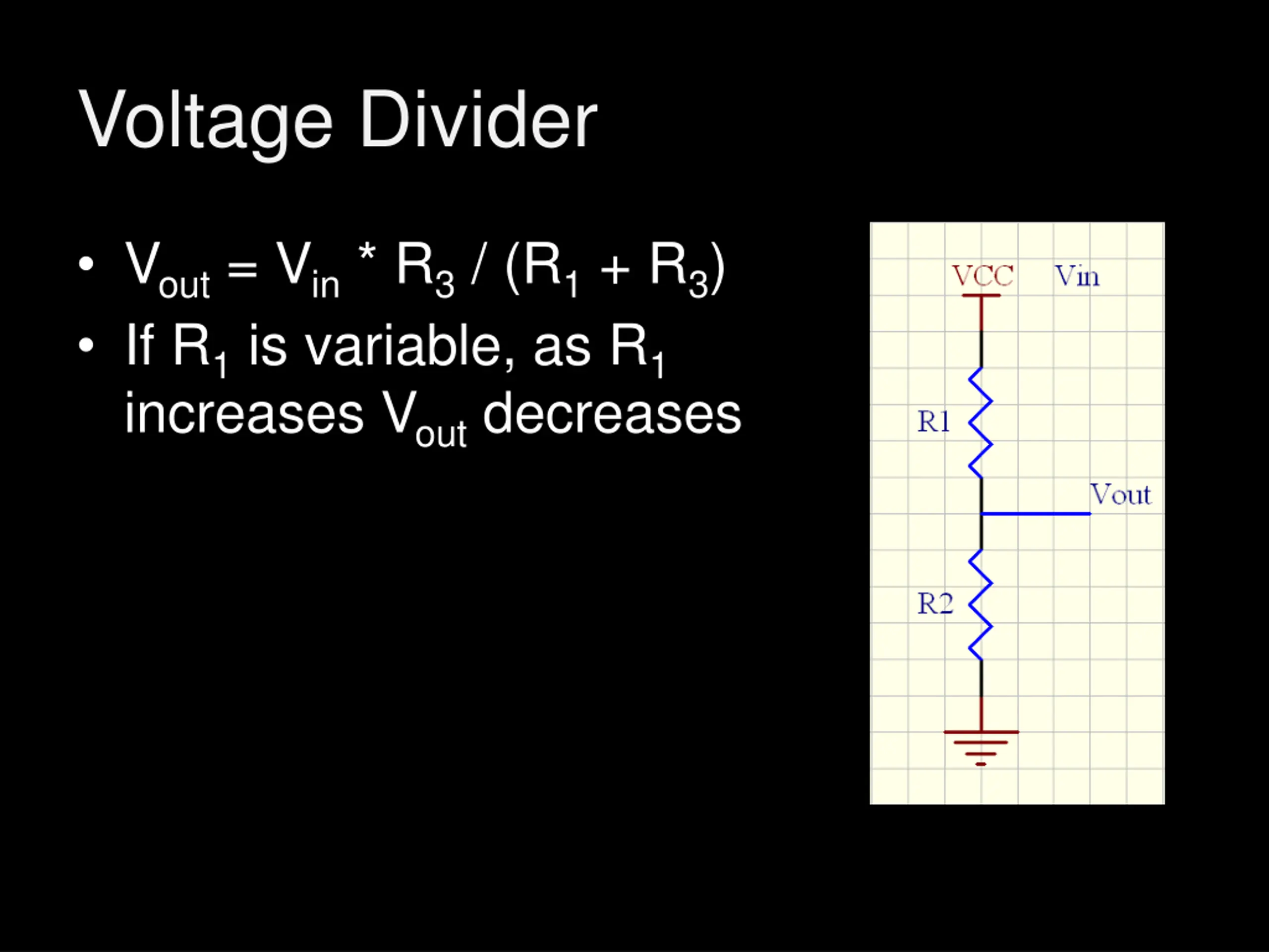 Voltage Divider Vout = Vin * R3 / (R1 + R3) If R1 is variable, as R1 increases Vout decreases