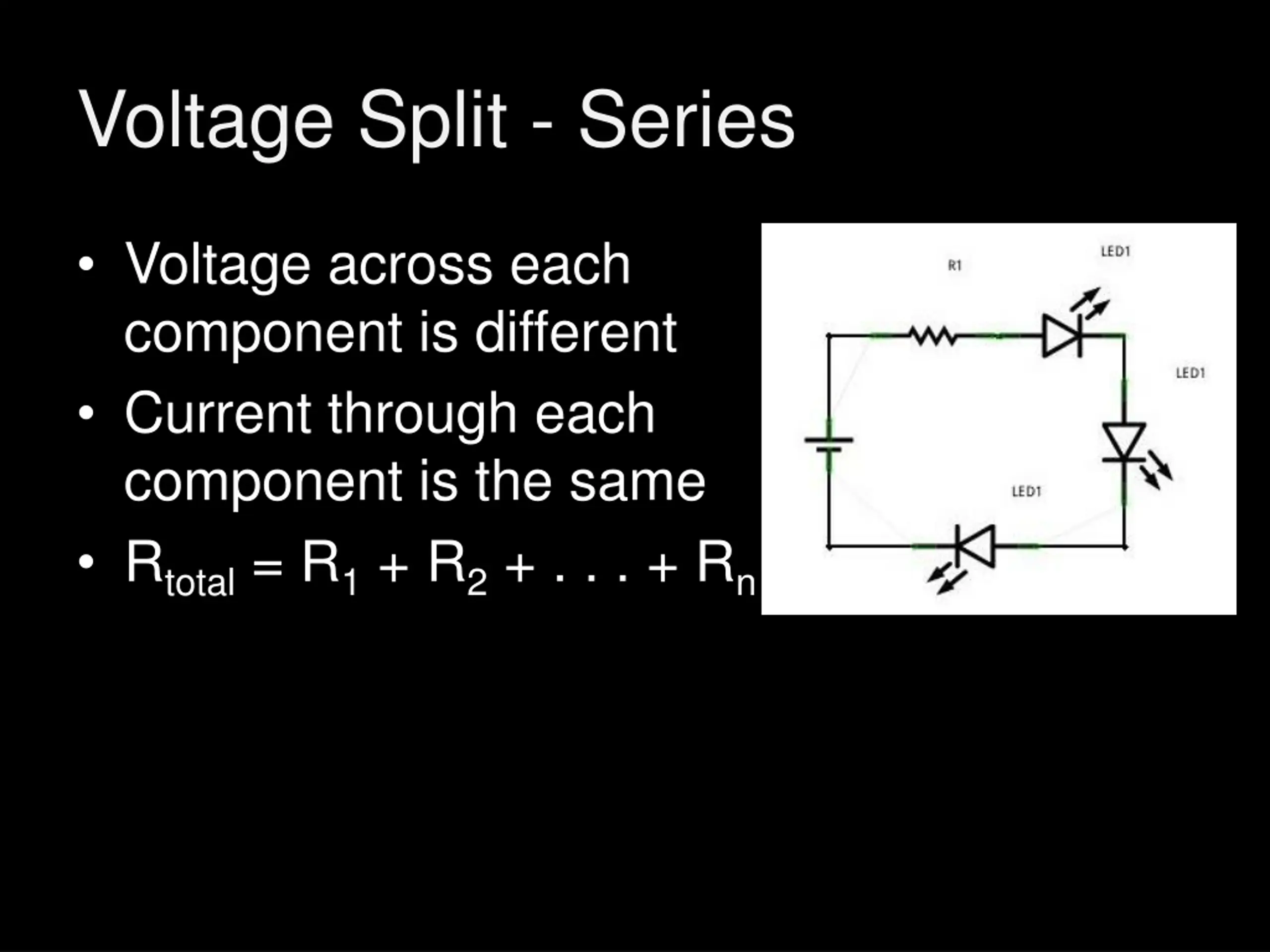Voltage Split - Series Voltage across each component is different Current through each component is the same Rtotal = R1 + R2 + . . . + Rn