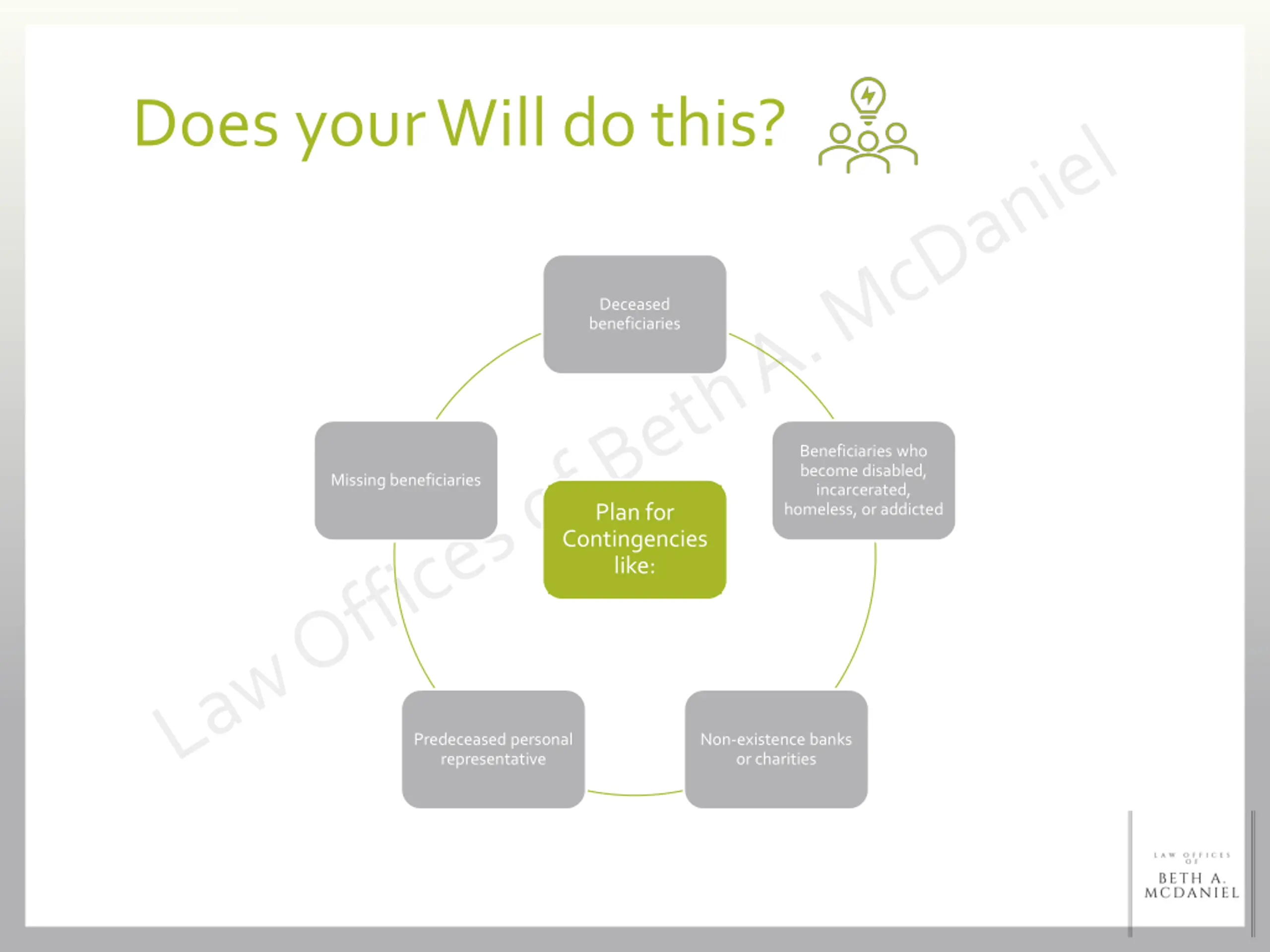 Does your Will do this? Deceased beneficiaries Beneficiaries who become disabled, incarcerated, homeless, or addicted Missing beneficiaries Plan for Contingencies like: Predeceased personal representative Non-existence banks or charities