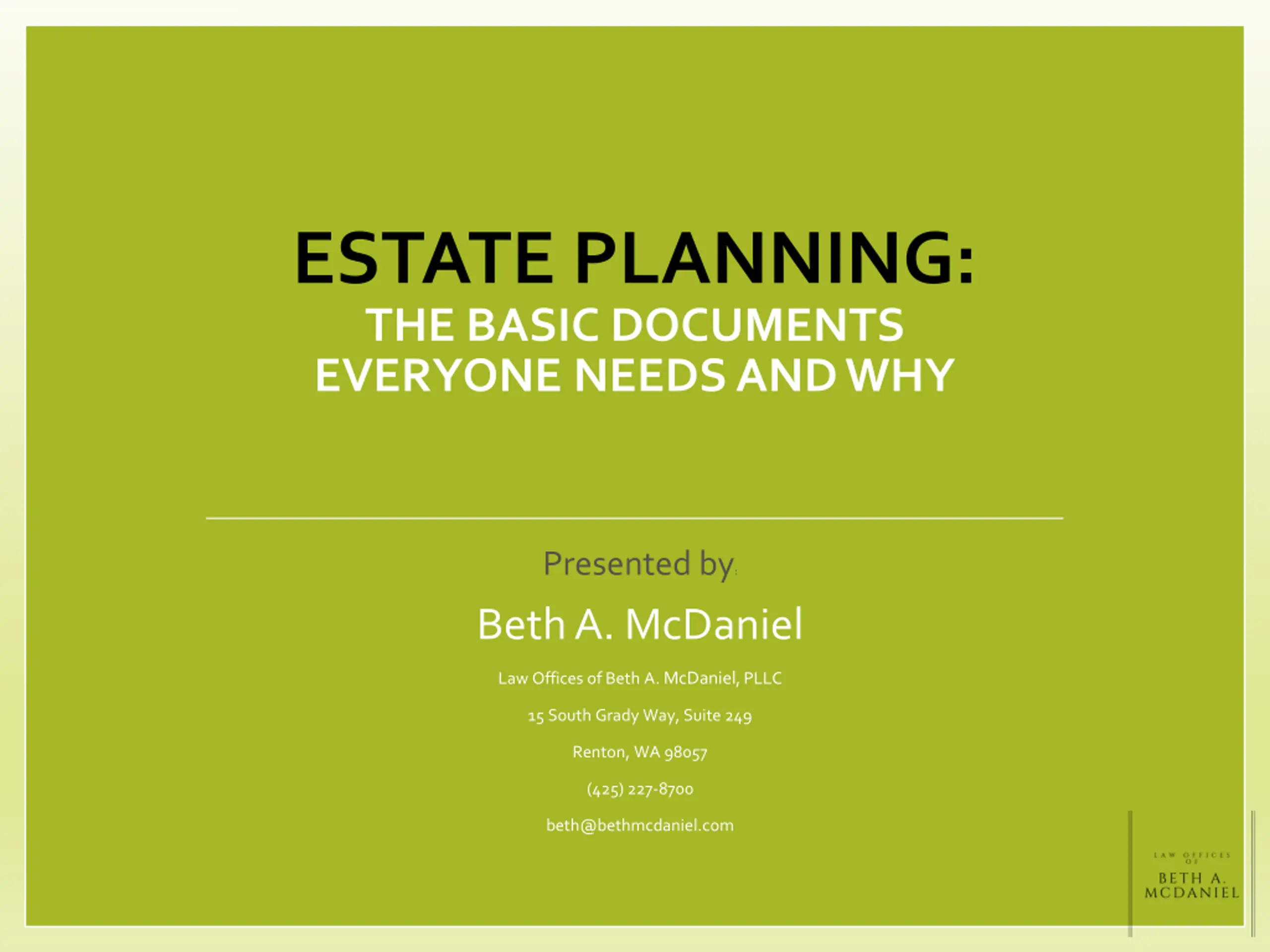ESTATE PLANNING: THE BASIC DOCUMENTS EVERYONE NEEDS AND WHY Presented by: Beth A. McDaniel Law Offices of Beth A. McDaniel, PLLC 15 South Grady Way, Suite 249 Renton, WA 98057 (425) 227-8700 beth@bethmcdaniel.com