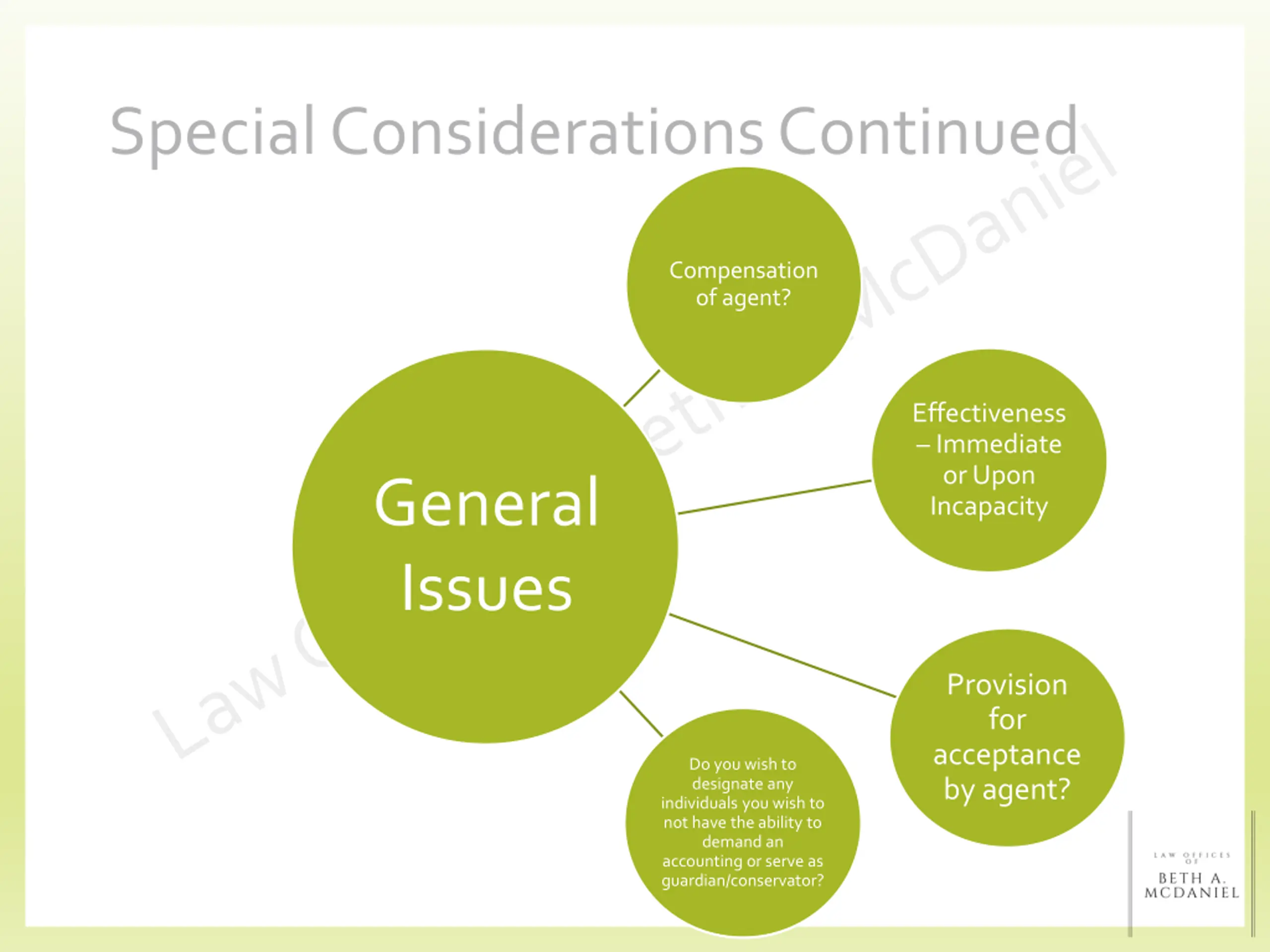 Special Considerations Continued Is effective immediately or on disability? Durable Power of Attorney for HEALTHCARE Decisions Is there the ability to delegate health care decisions?