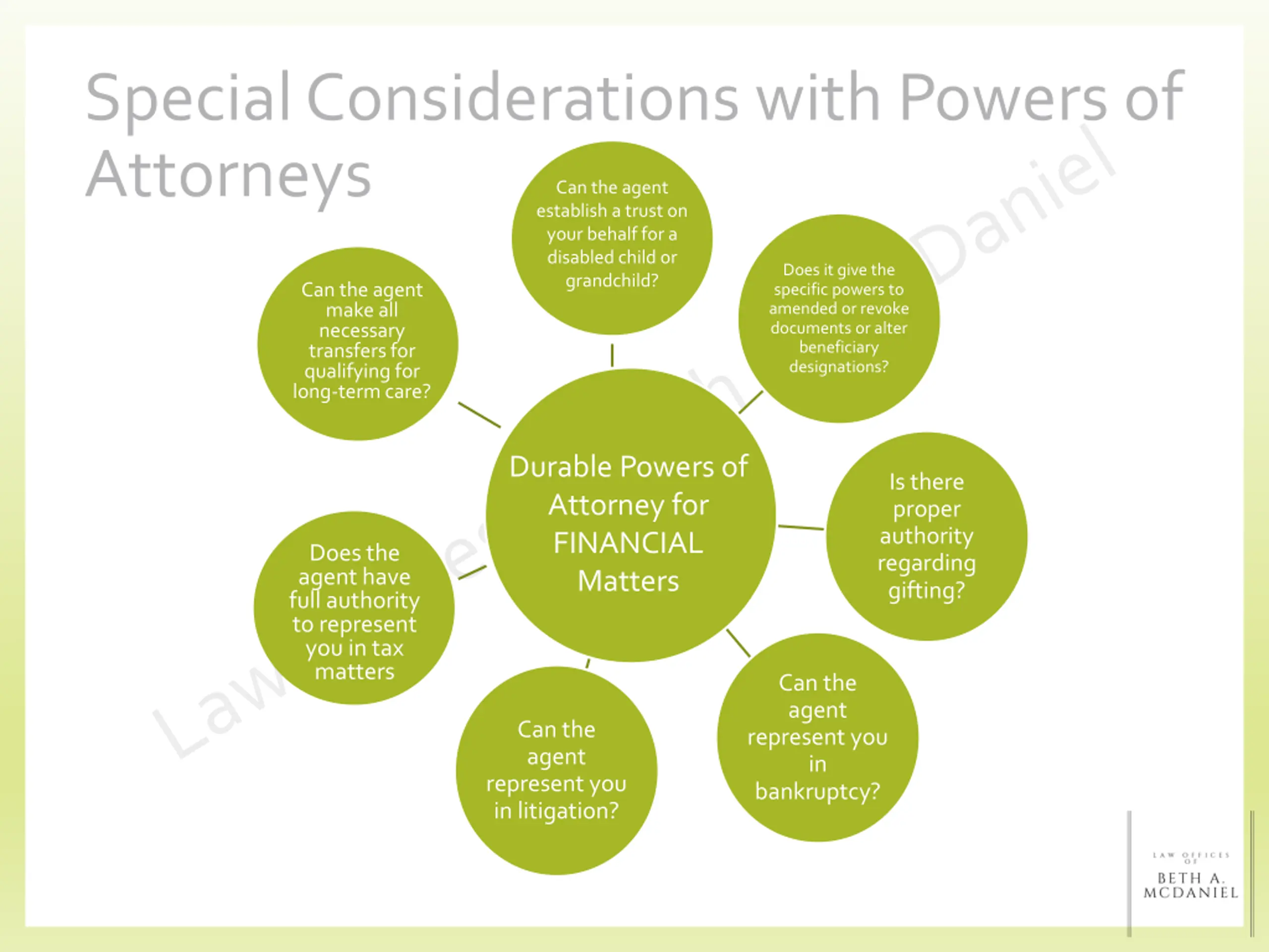 Special Considerations with Powers of Attorneys establish a trust on your behalf for a disabled child or grandchild? Can the agent make all necessary transfers for qualifying for long-term care? Can the agent Does it give the specific powers to amended or revoke documents or alter beneficiary designations? Durable Powers of Attorney for FINANCIAL Matters Is there proper authority regarding gifting? Does the agent have full authority to represent you in tax matters Can the agent represent you in bankruptcy? Can the agent represent you in litigation?