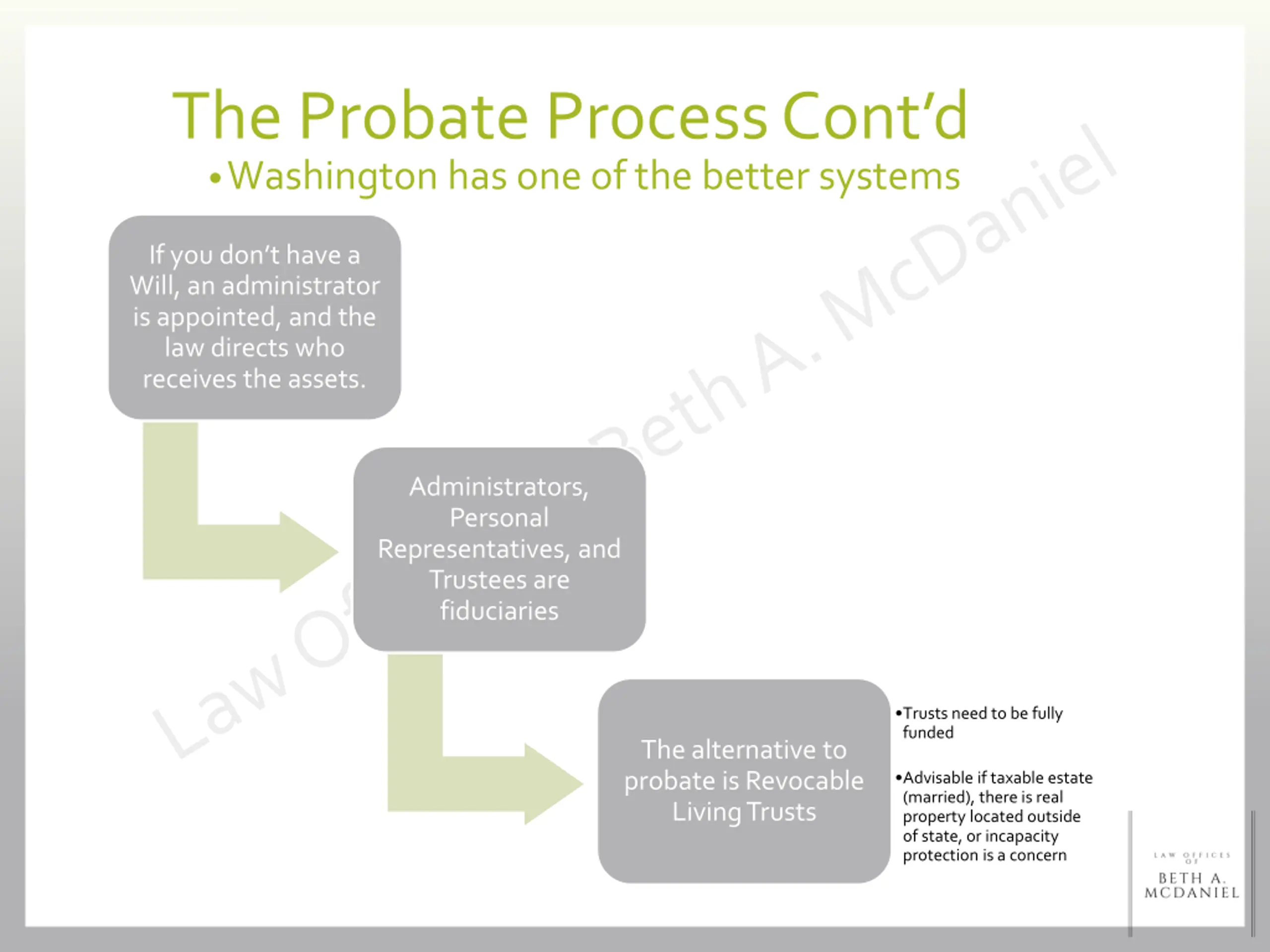 The Probate Process Contd Washington has one of the better systems If you don t have a Will, an administrator is appointed, and the law directs who receives the assets. Administrators, Personal Representatives, and Trustees are fiduciaries Trusts need to be fully funded The alternative to probate is Revocable Living Trusts Advisable if taxable estate (married), there is real property located outside of state, or incapacity protection is a concern
