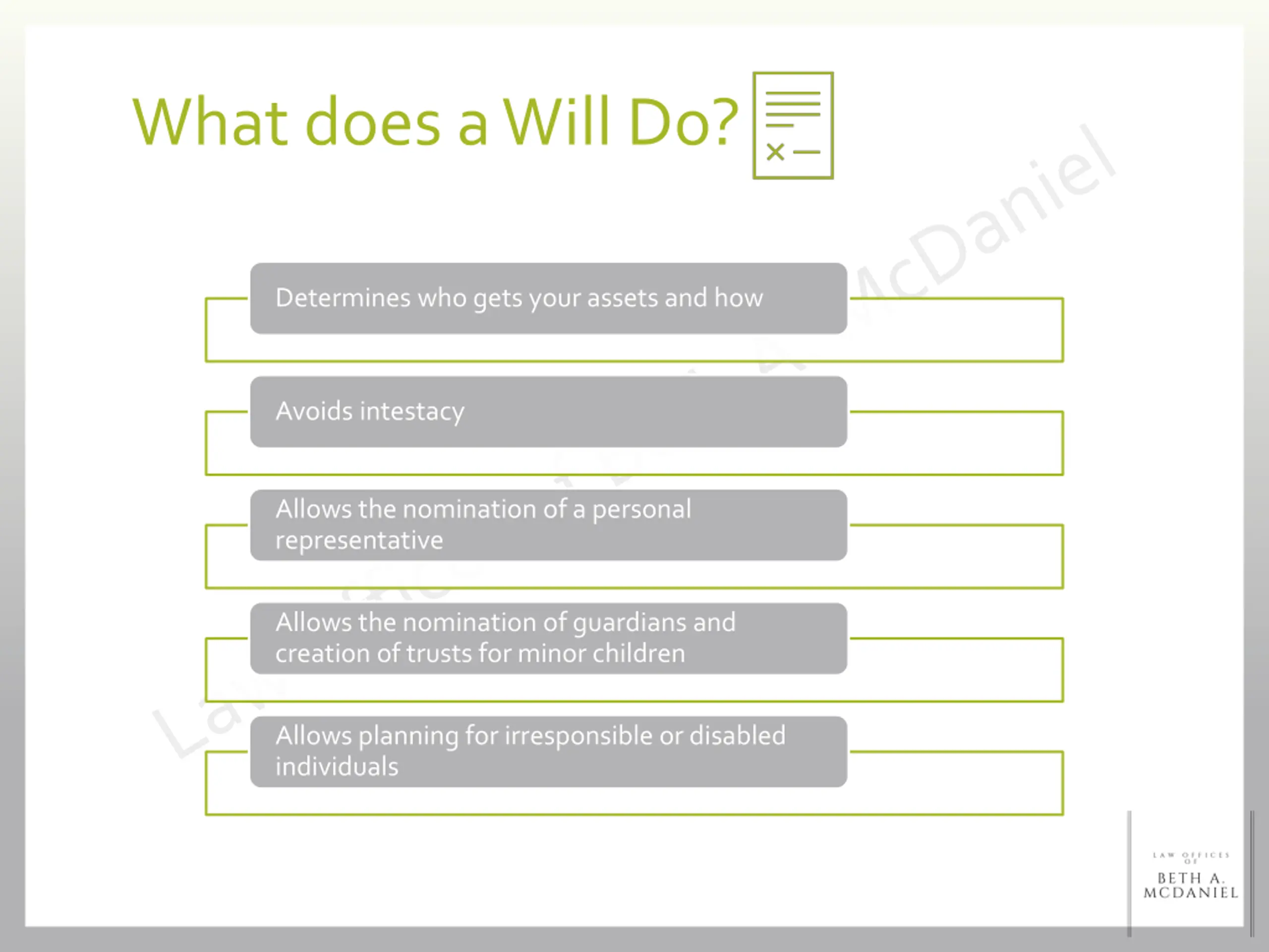 What does a Will Do? Determines who gets your assets and how Avoids intestacy Allows the nomination of a personal representative Allows the nomination of guardians and creation of trusts for minor children Allows planning for irresponsible or disabled individuals