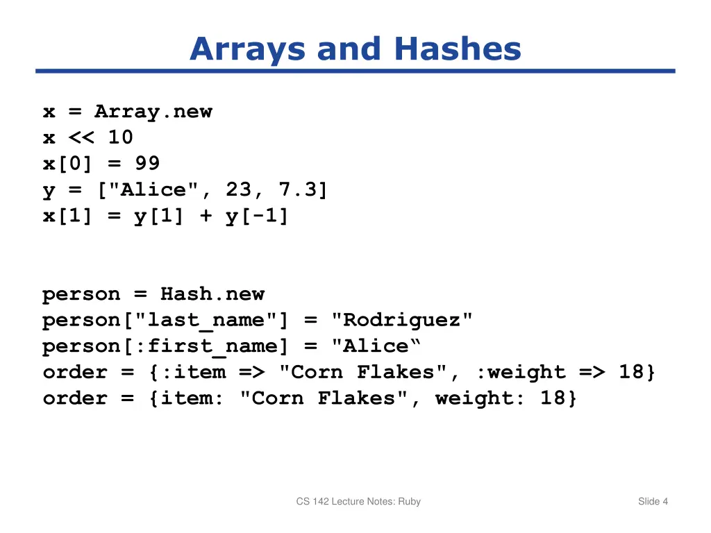 Arrays and Hashes x = Array.new x << 10 x[0] = 99 y = ["Alice", 23, 7.3] x[1] = y[1] + y[-1] person = Hash.new person["last_name"] = "Rodriguez" person[:first_name] = "Alice order = {:item => "Corn Flakes", :weight => 18} order = {item: "Corn Flakes", weight: 18} CS 142 Lecture Notes: Ruby Slide 4